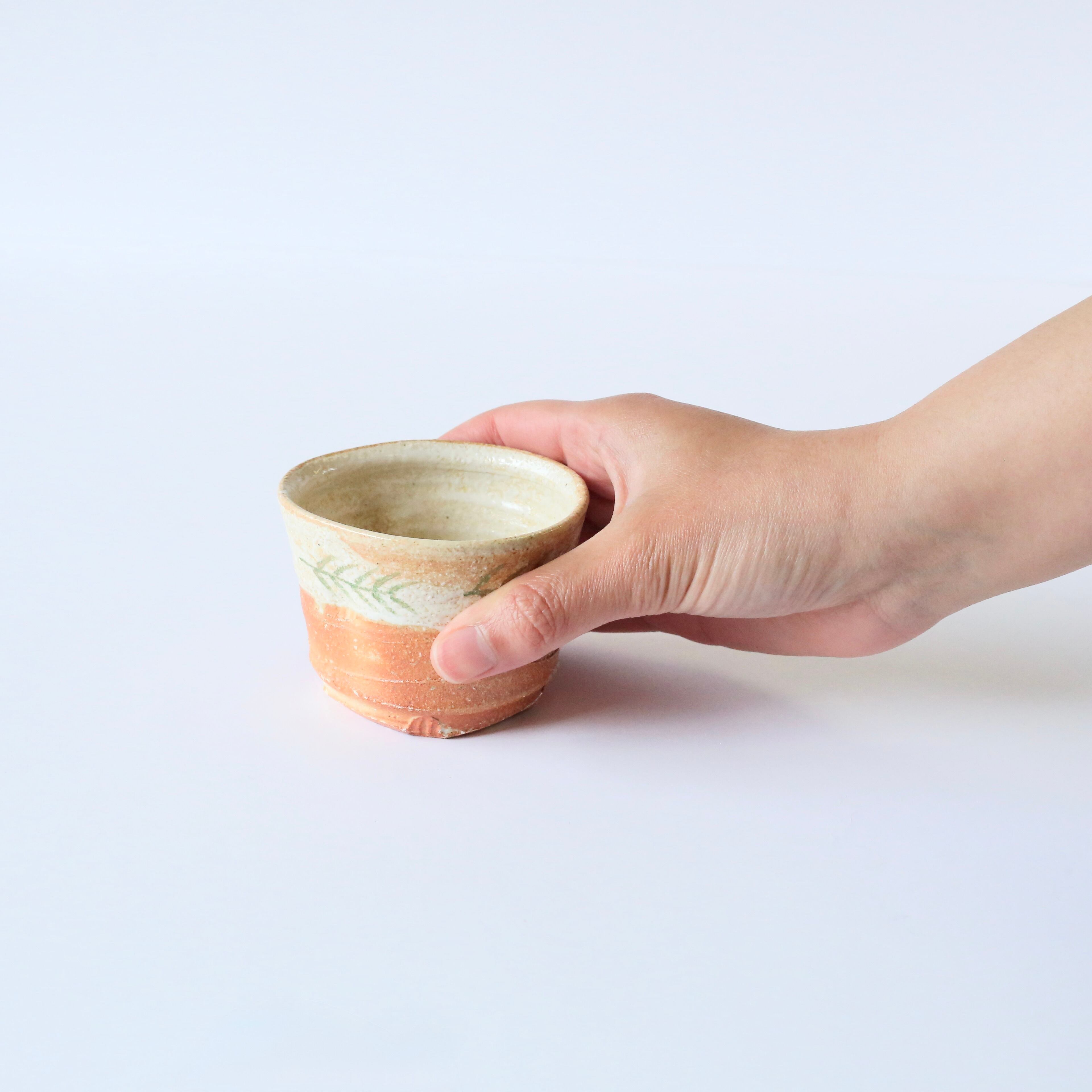 焼き締めのカップに絵付けをほどこした、一点もののカップです。