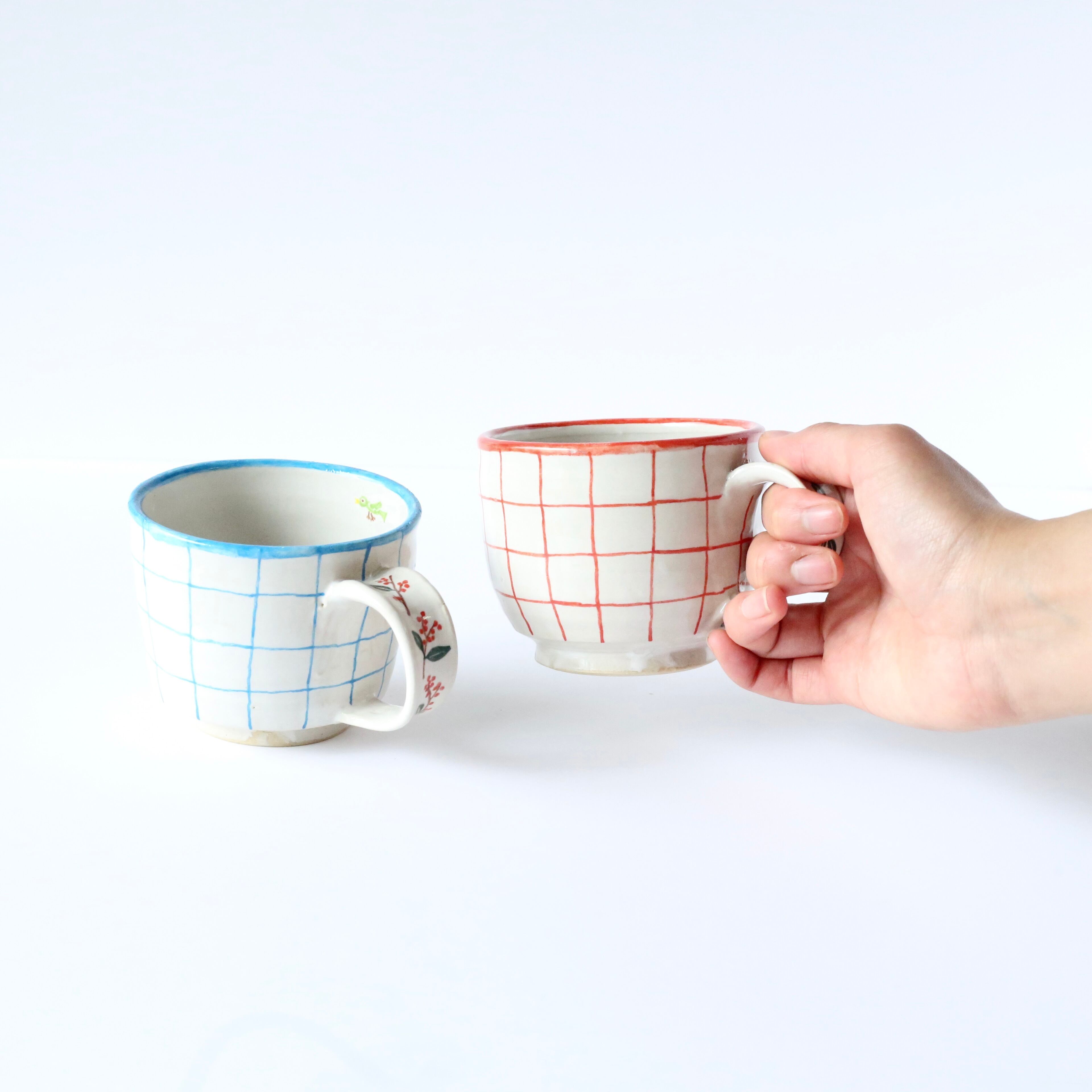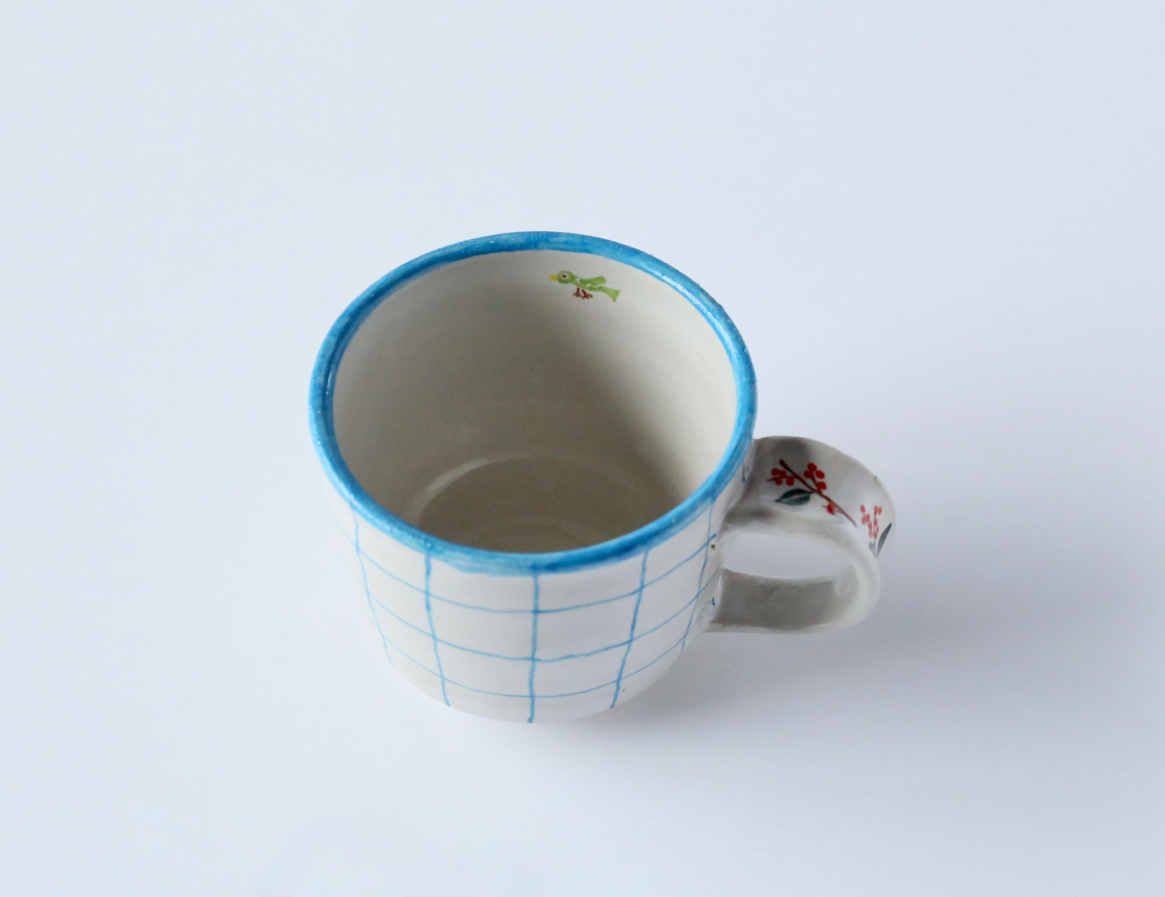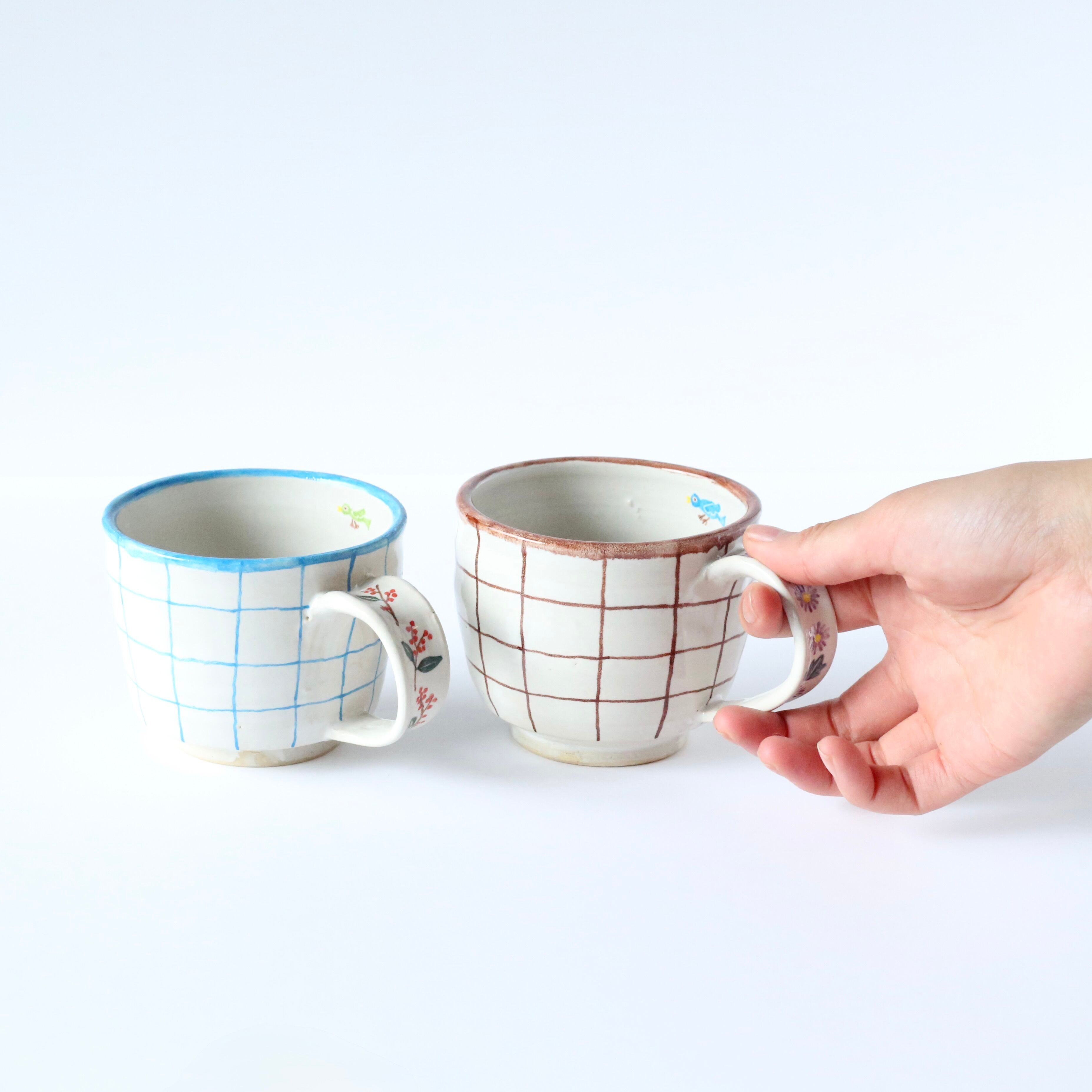 チェック模様はよくあるデザインですが、植物や鳥を入れた藍菖窯らしいマグカップになっています。