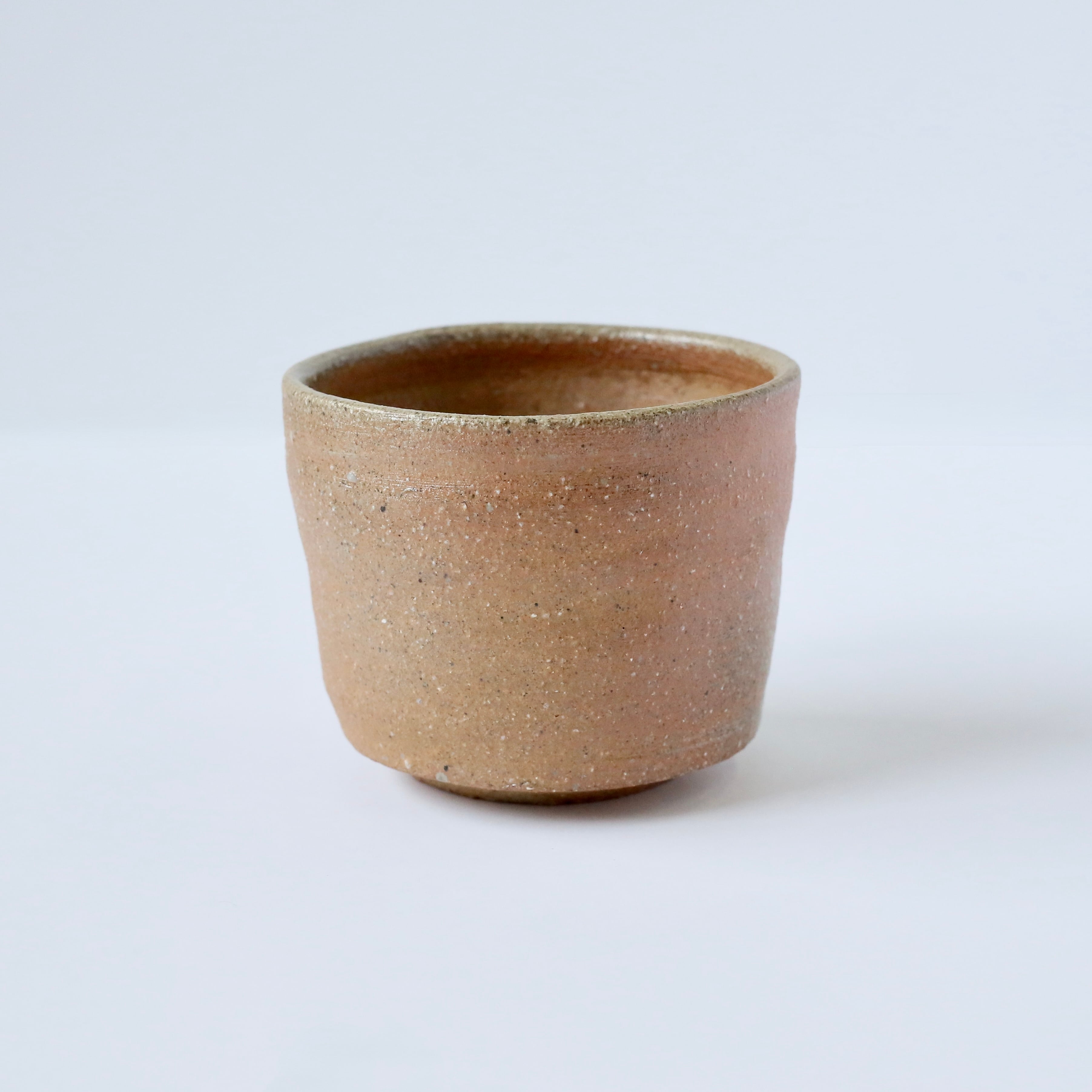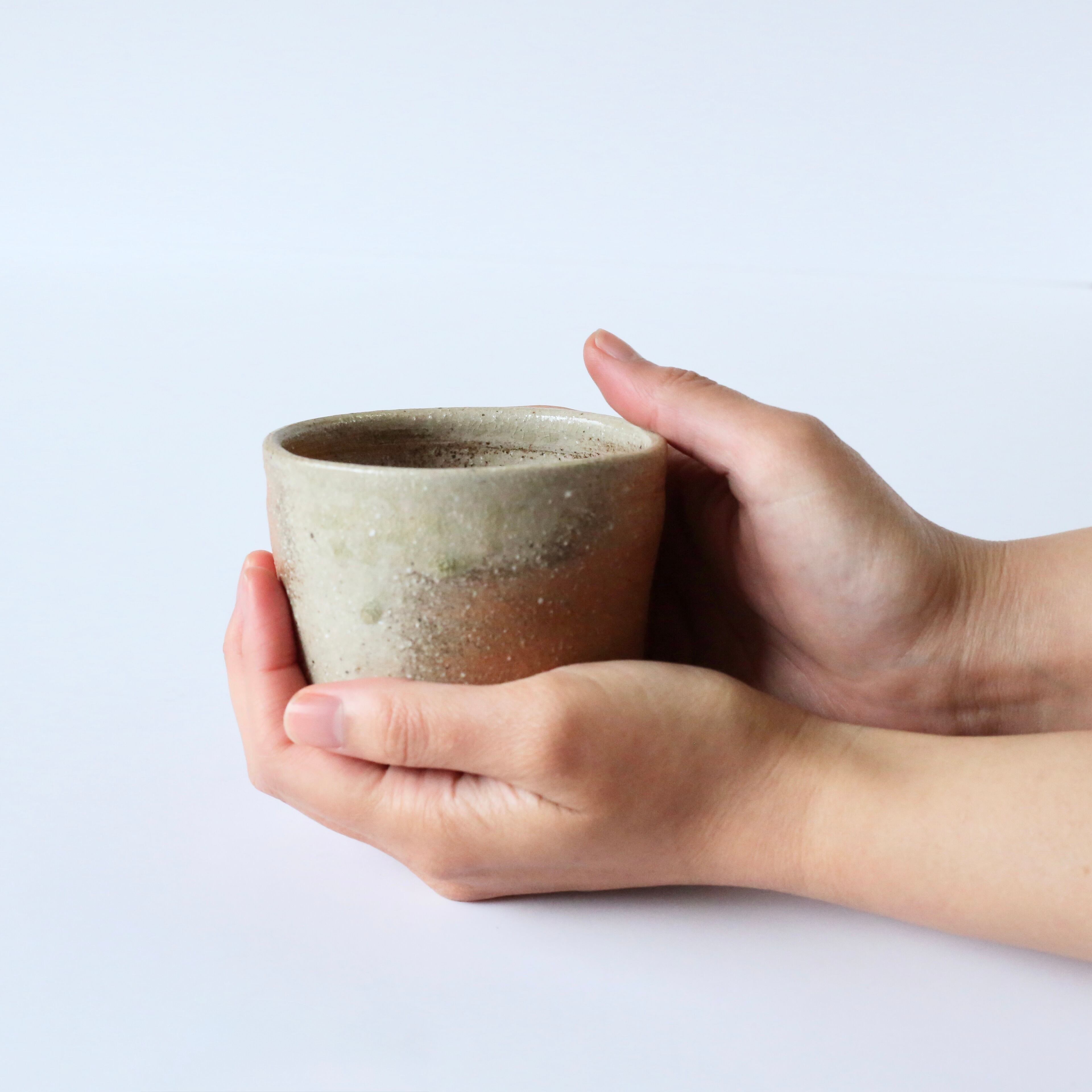 A wood-fired yunomi teacup distinguished by its gentle tones and unique texture.