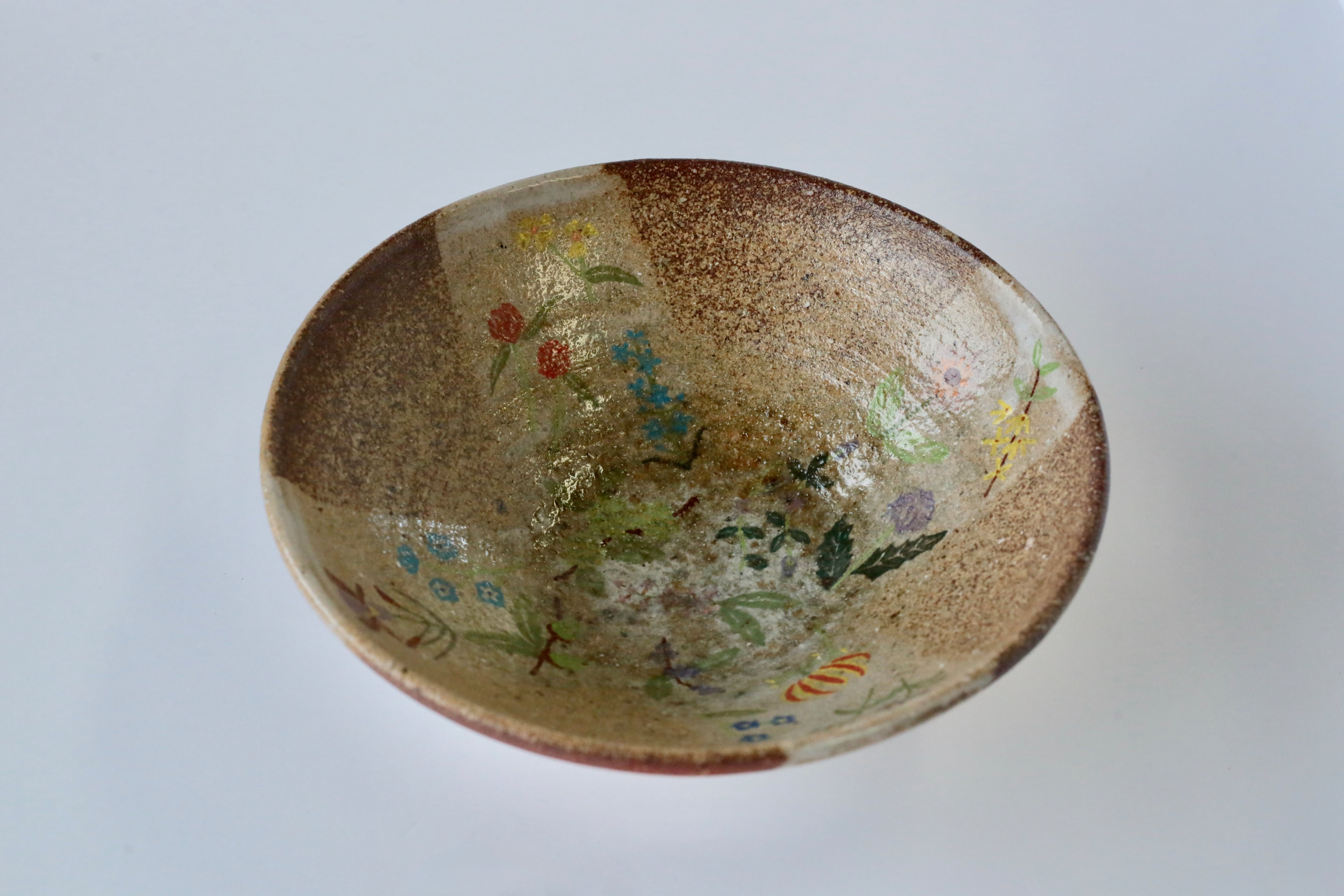元の器の表情もしっかり残りつつ、渋さの中にこだわって描かれた優しい植物たちが器を彩っています。