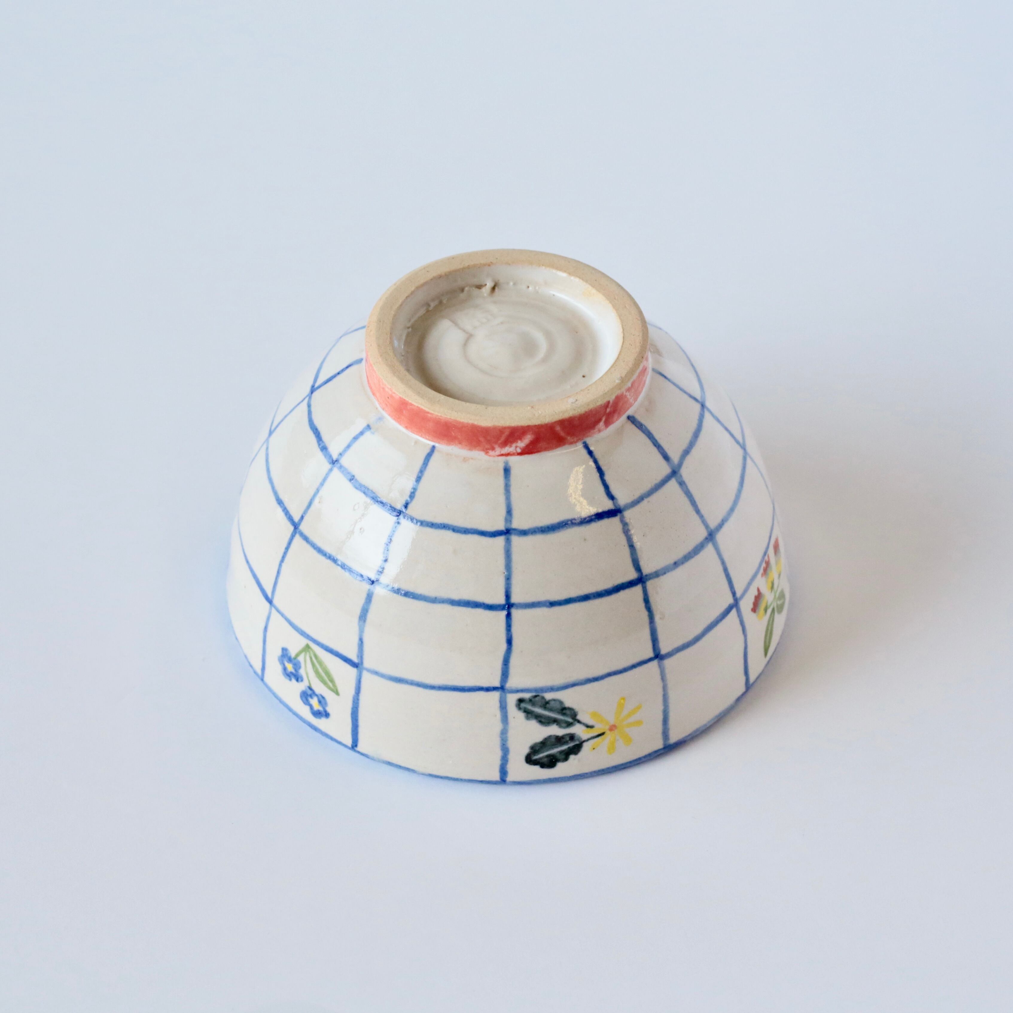 This bowl features a vivid blue graph check pattern beautifully set against a white glazed surface.