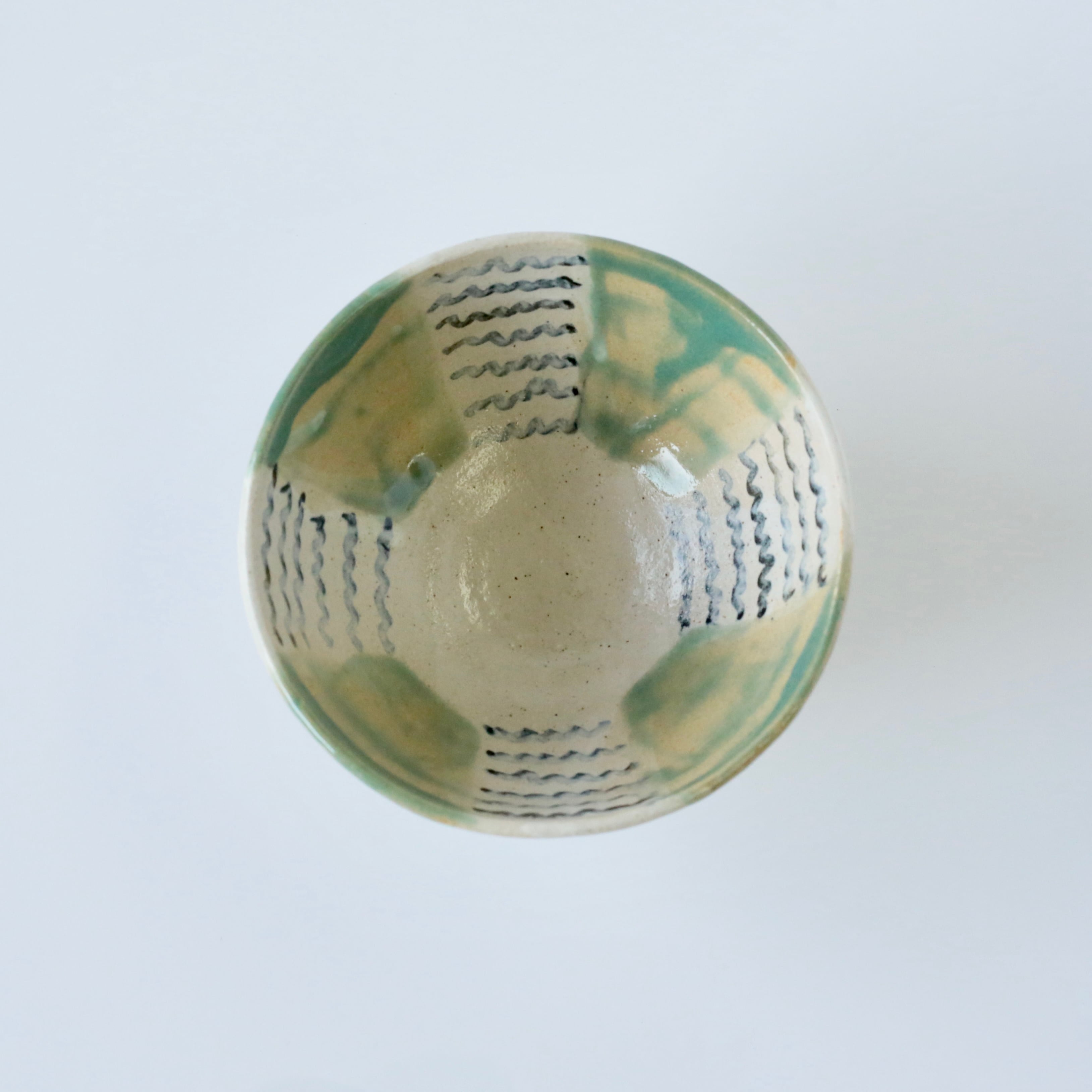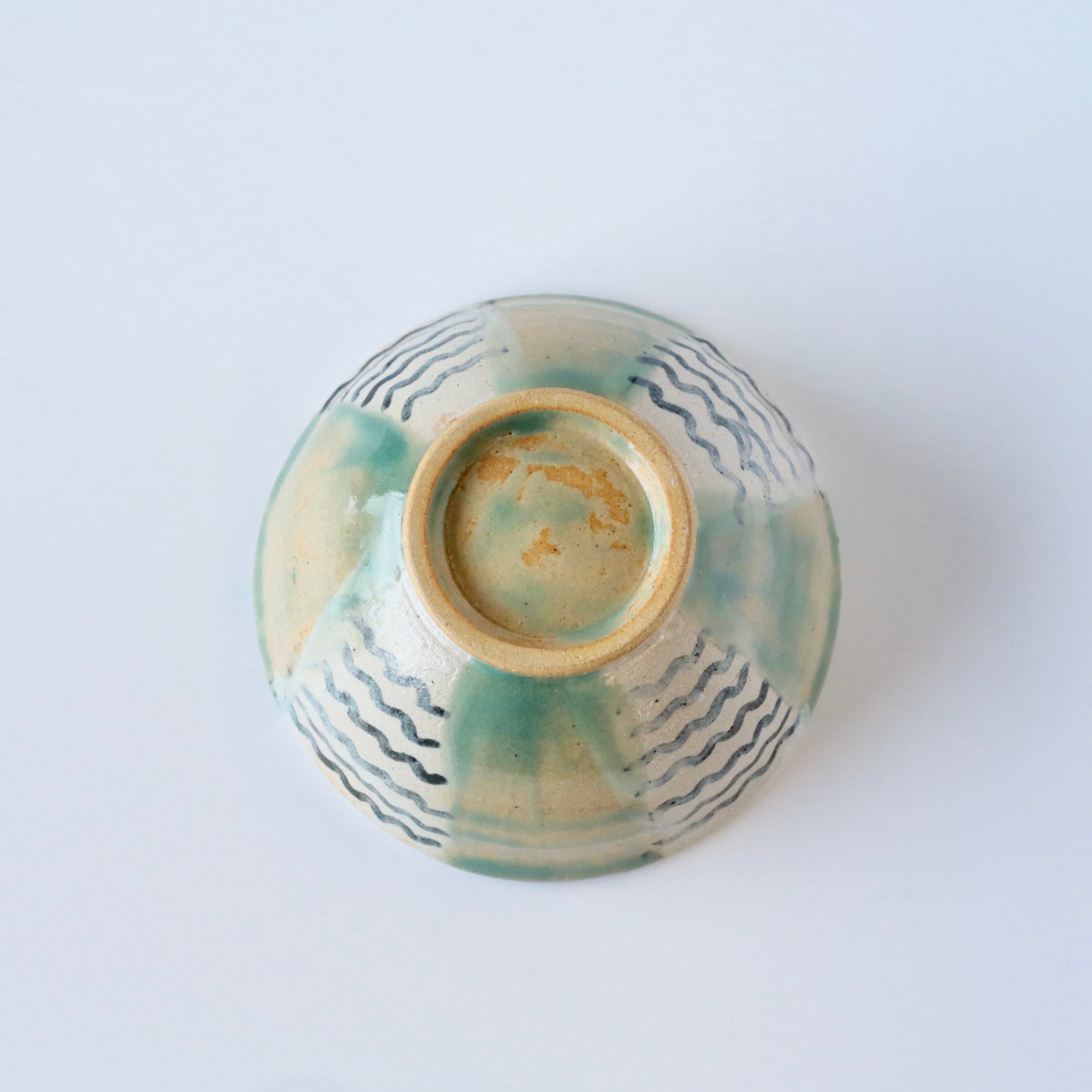 翡翠の釉薬が美しく輝く、母の手描きによる波模様の茶碗です。