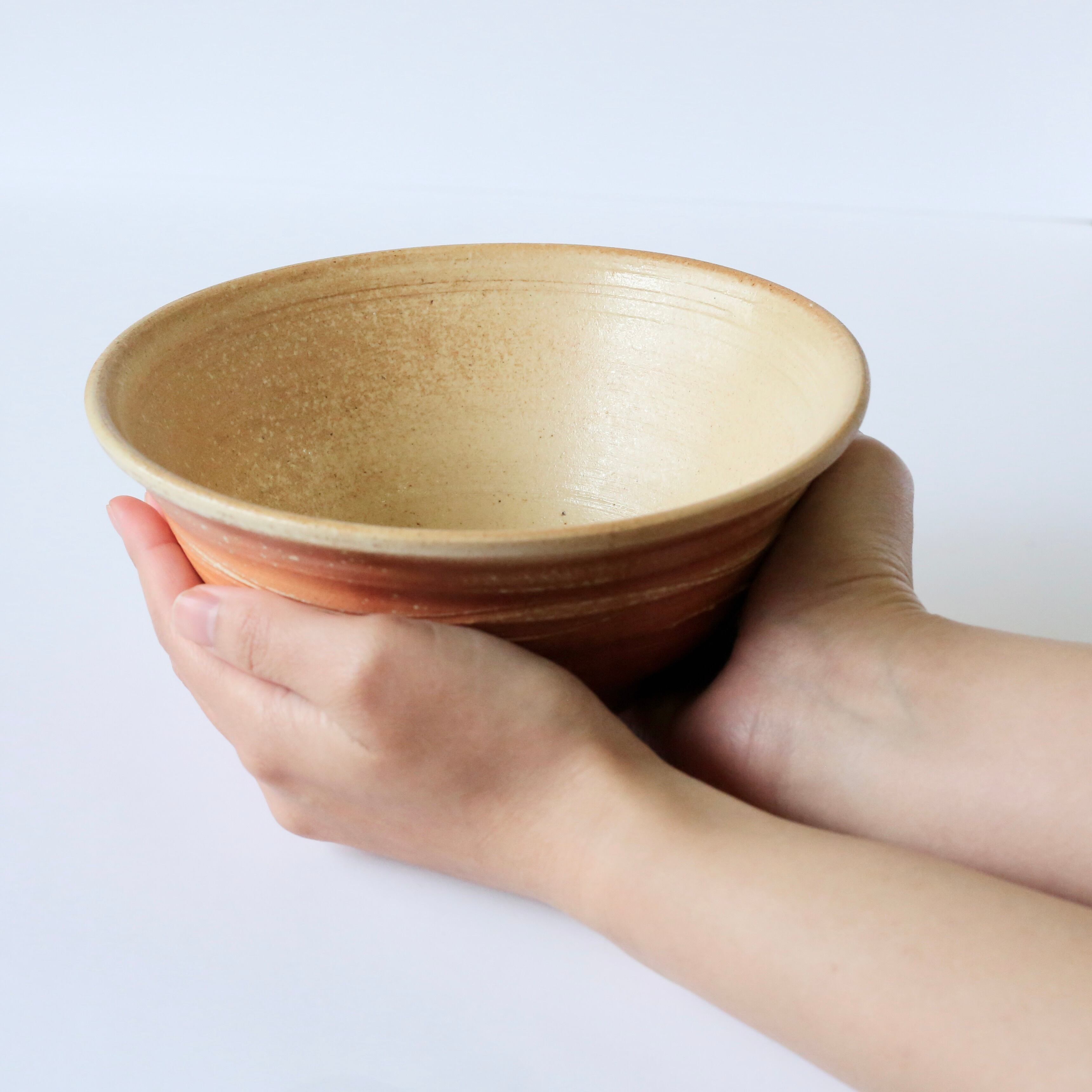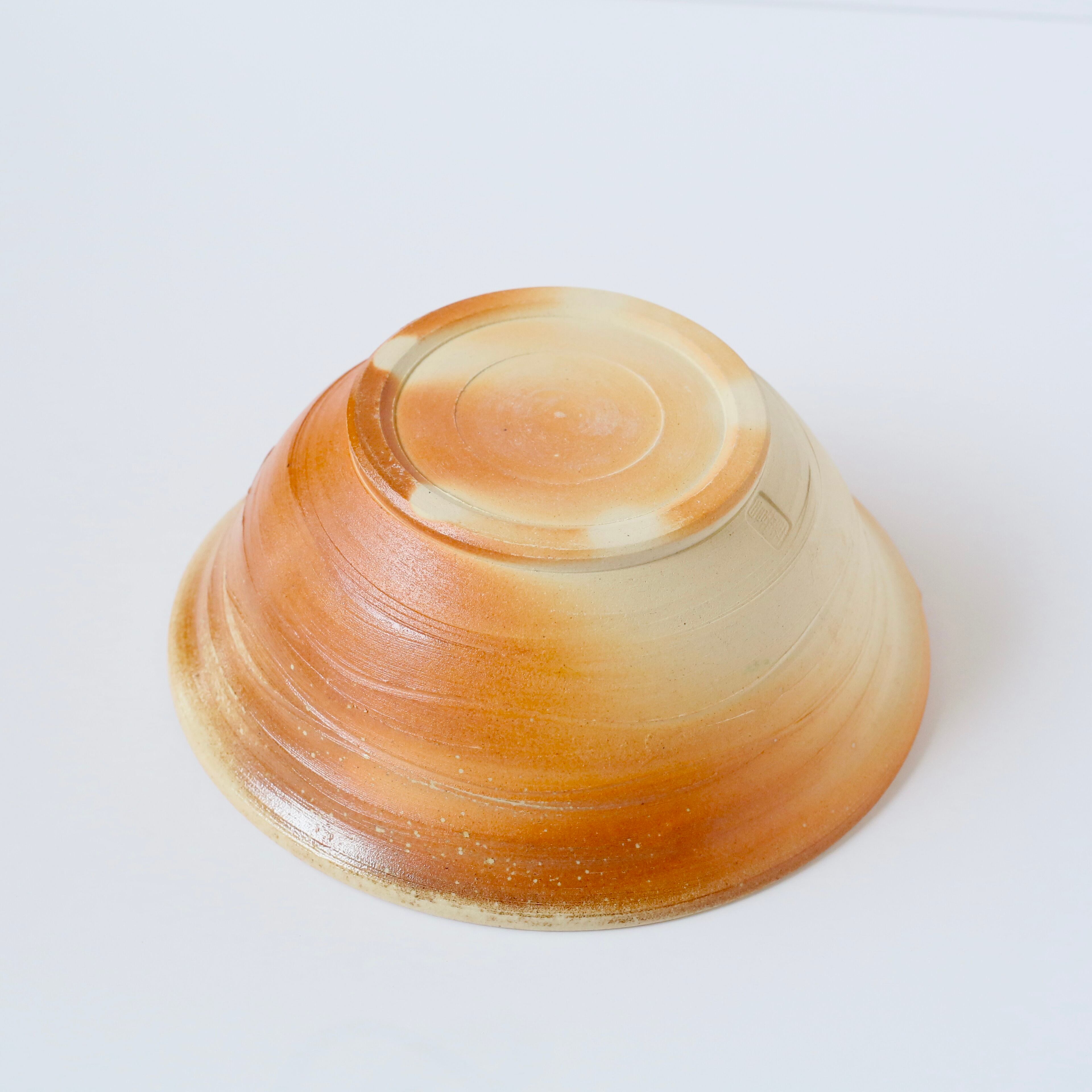 鮮やかなオレンジの炎の色と、柔らかな土の色が絶妙に混ざり合い、温もりを感じさせる器です。