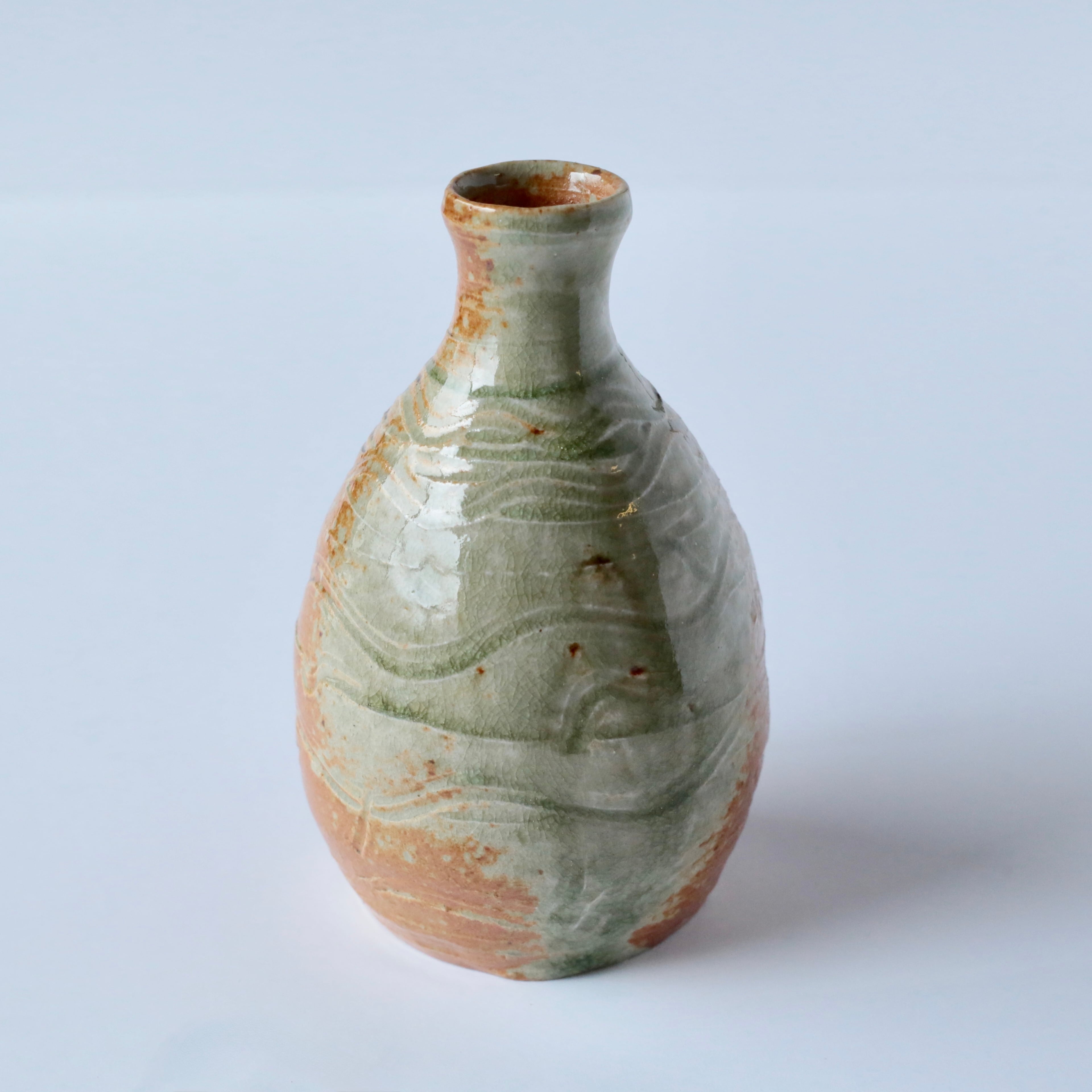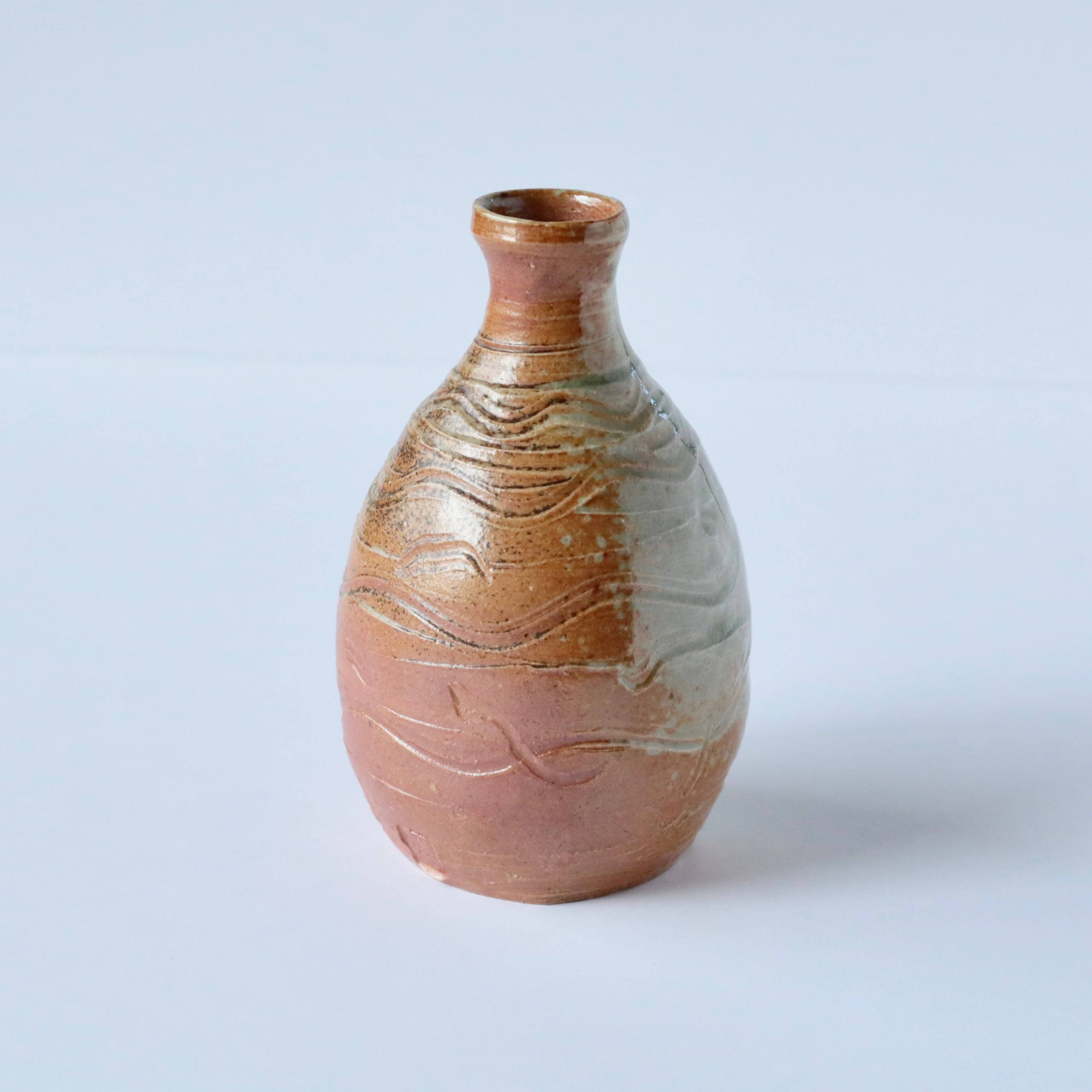 Its distinctive tokkuri-shaped form is highlighted by a rich red-brown surface, beautifully contrasted with vivid, glassy bidoro effects.