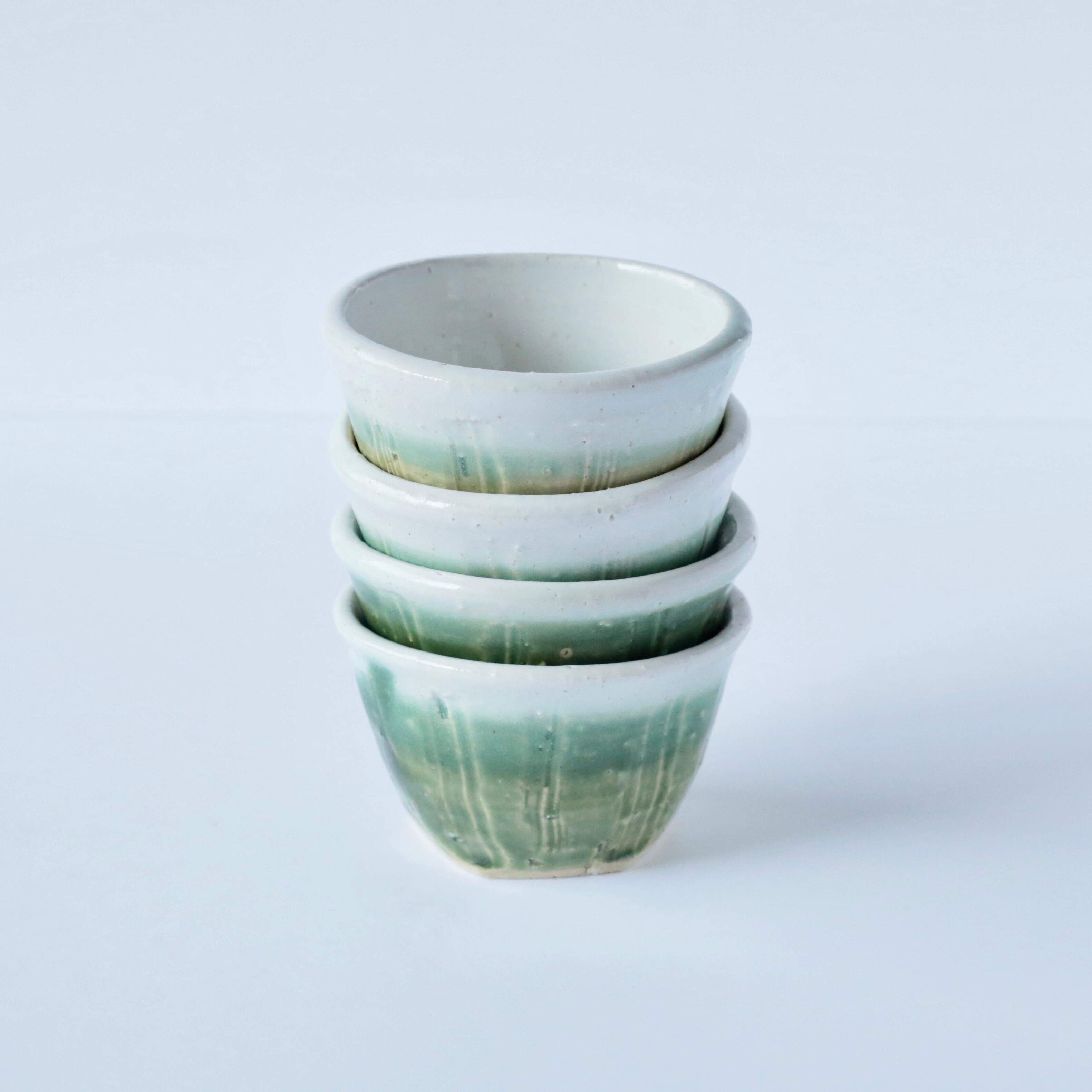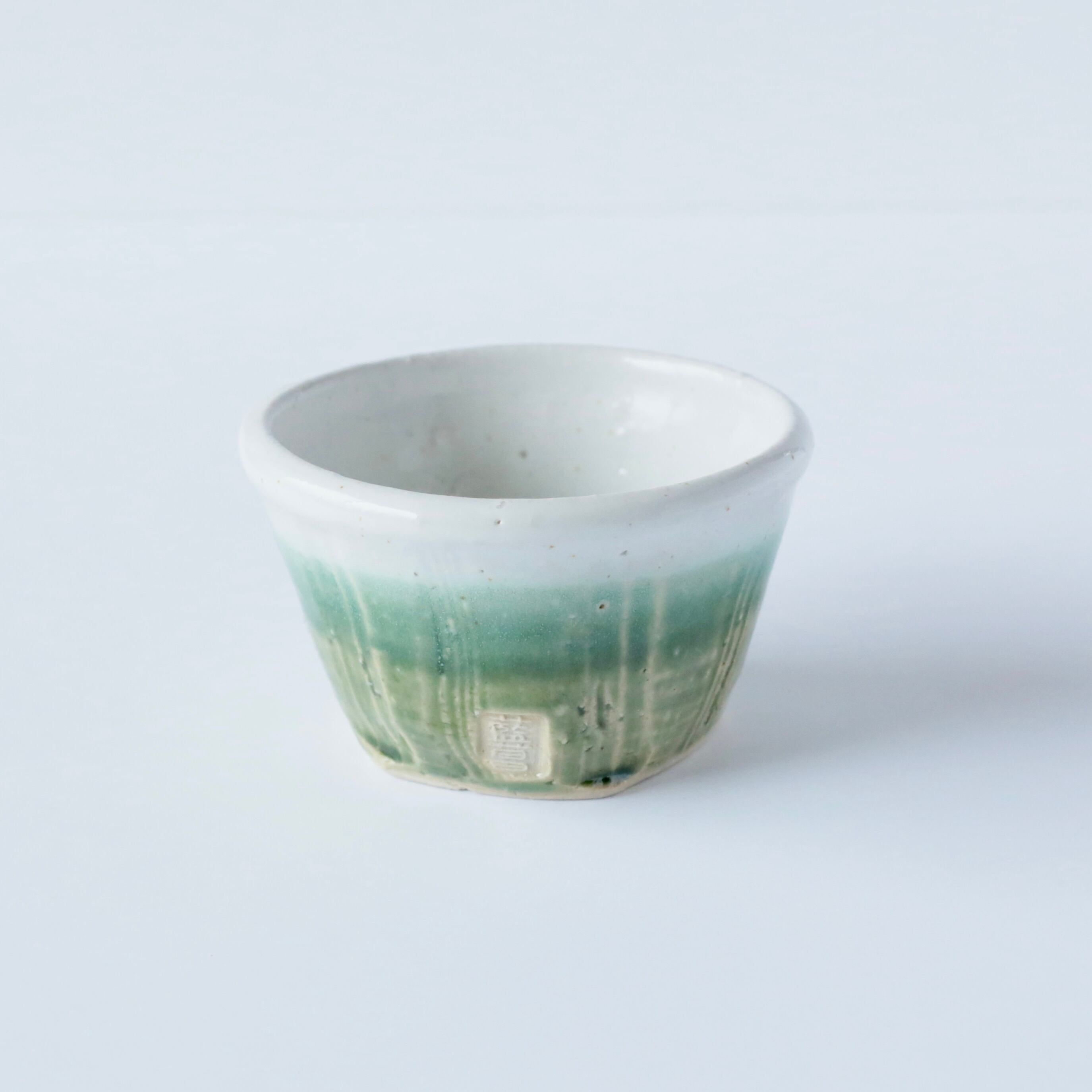 こちらの小鉢は、2色のグリーンの釉薬が穏やかに交わって、まるで森林の中の空気のような色合いを生み出しています。