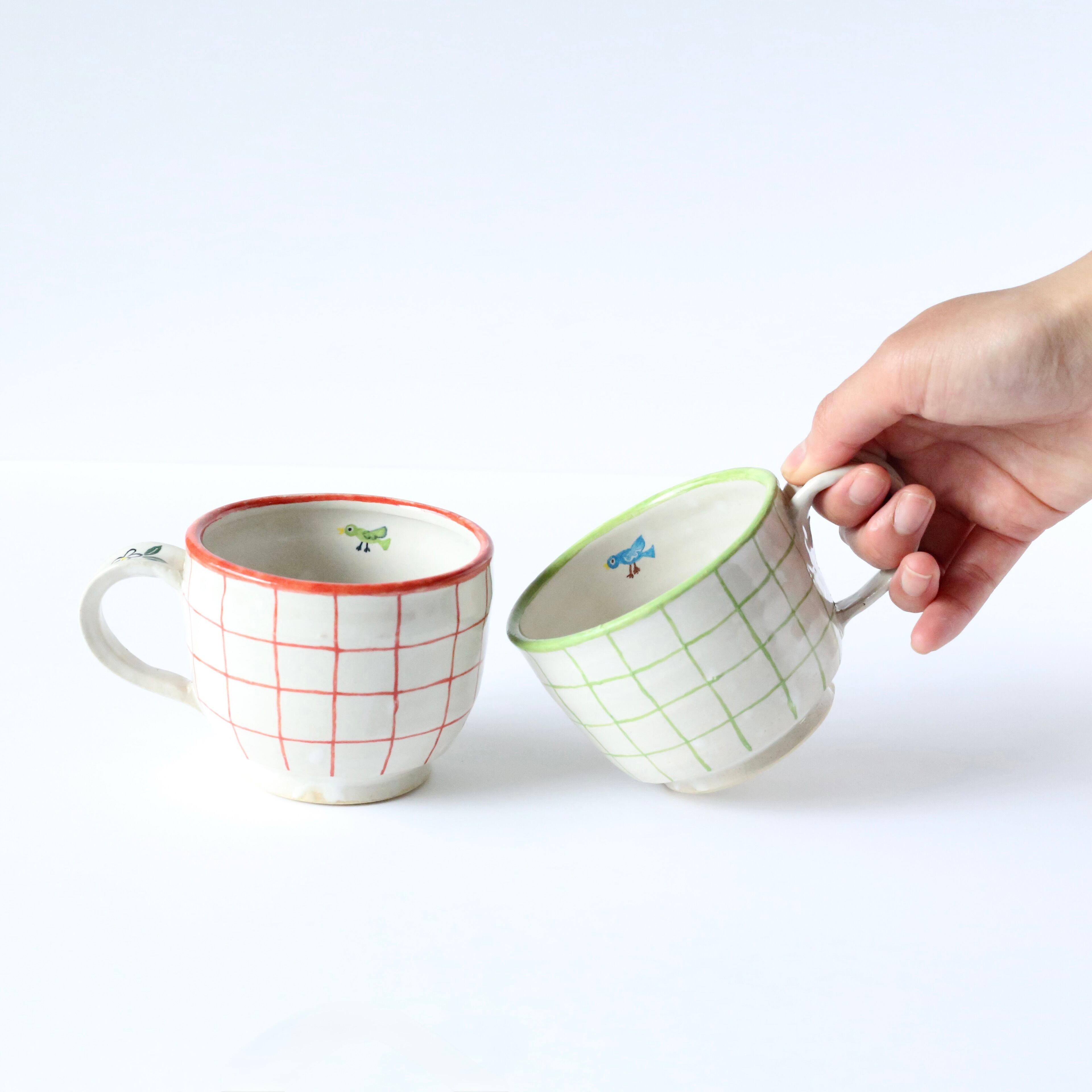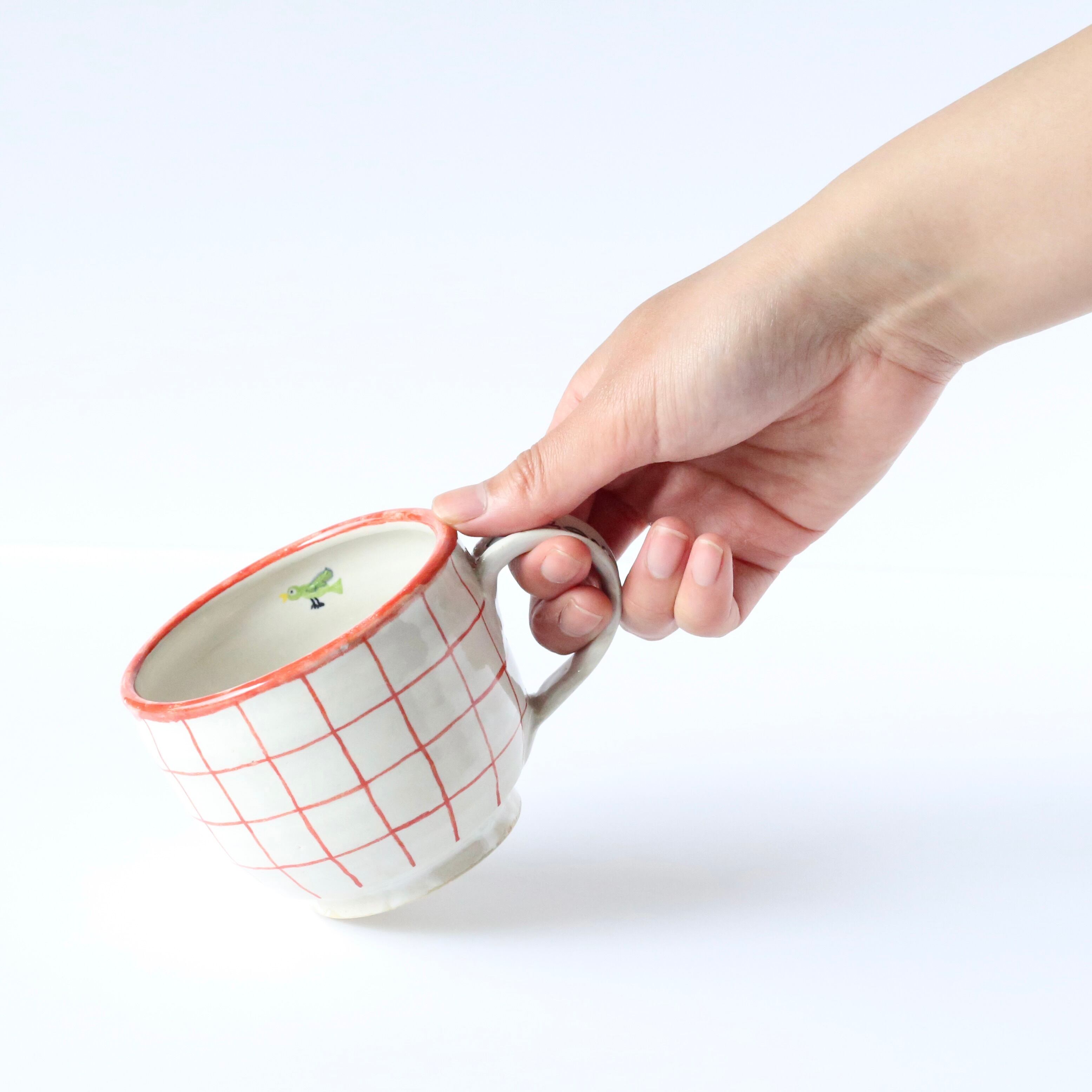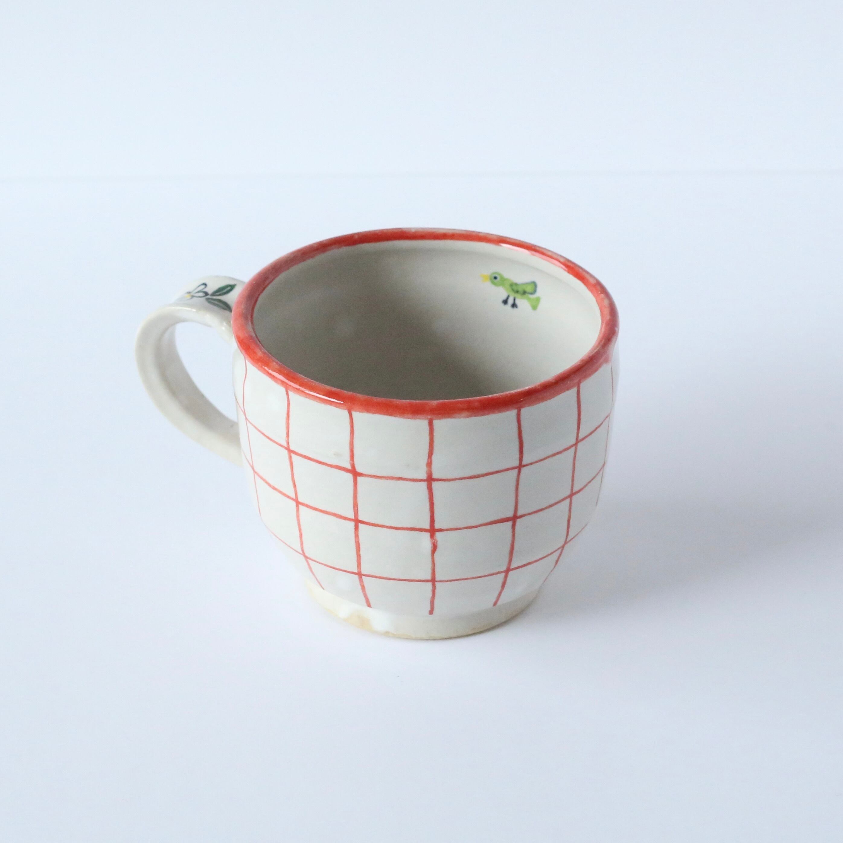 チェック模様はよくあるデザインですが、植物や鳥を入れた藍菖窯らしいマグカップになっています。