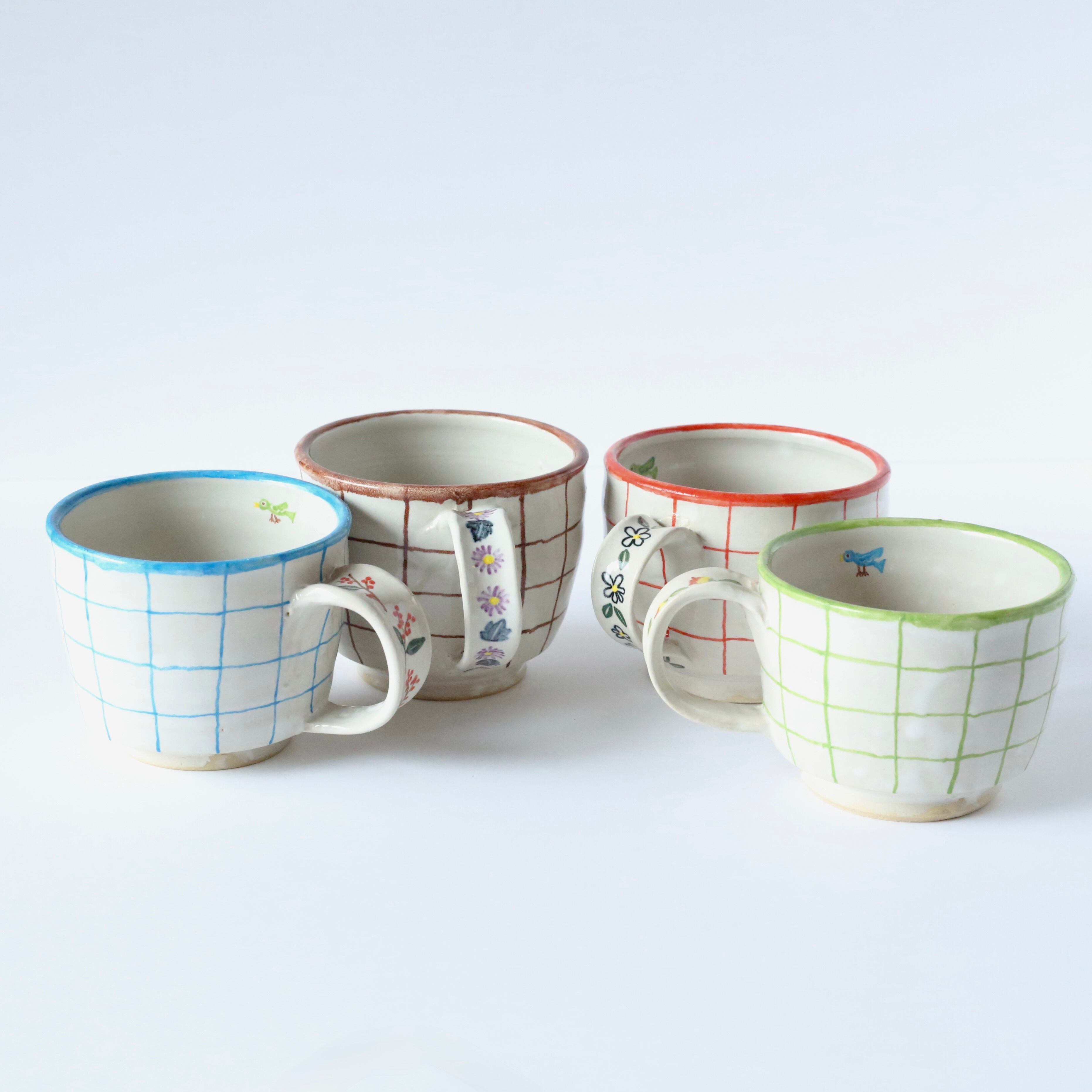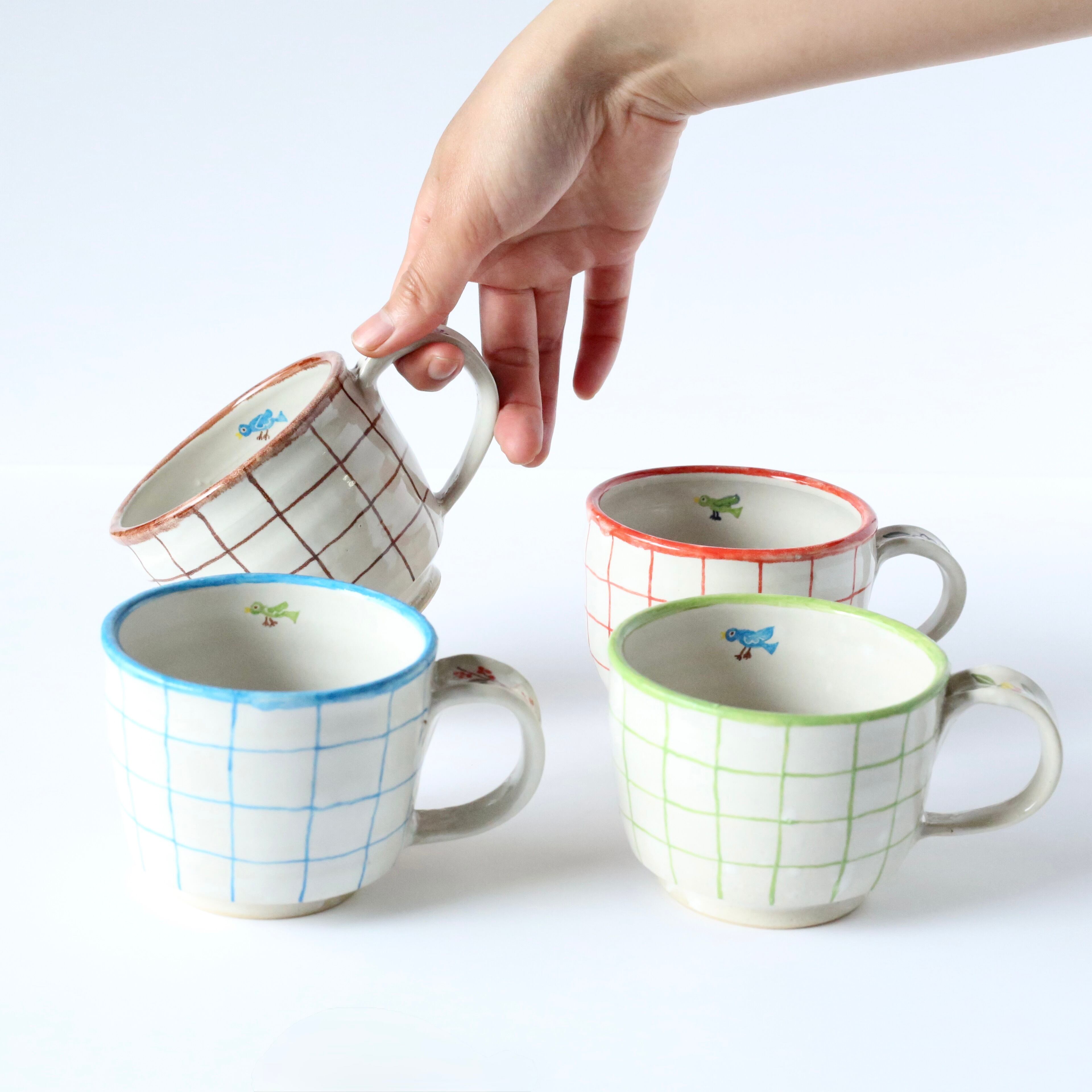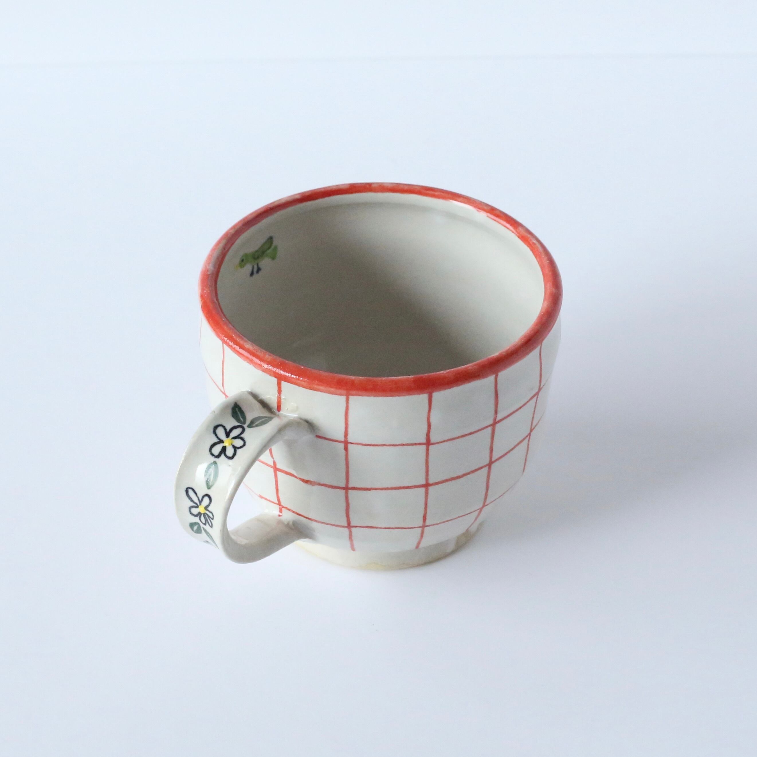 チェック模様はよくあるデザインですが、植物や鳥を入れた藍菖窯らしいマグカップになっています。