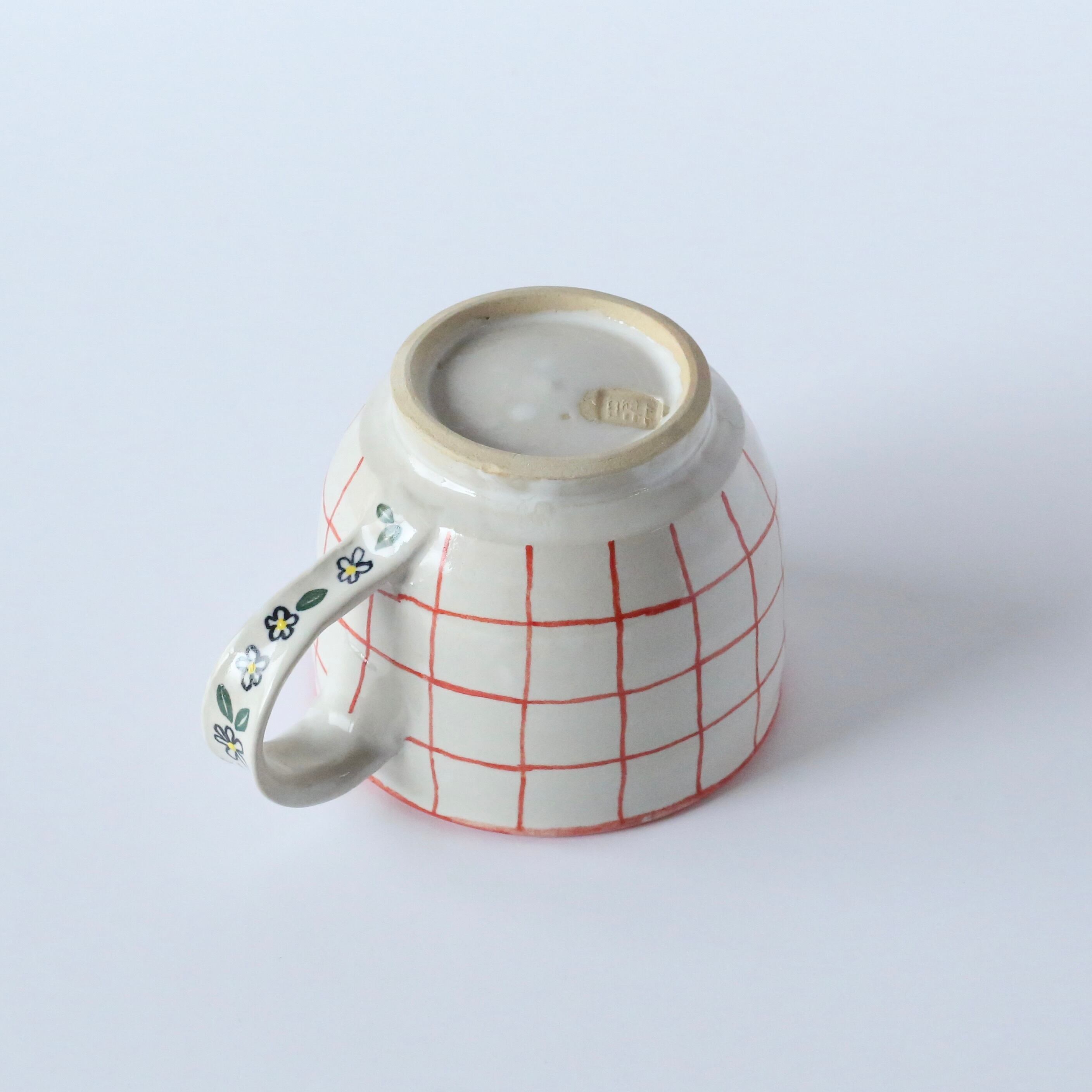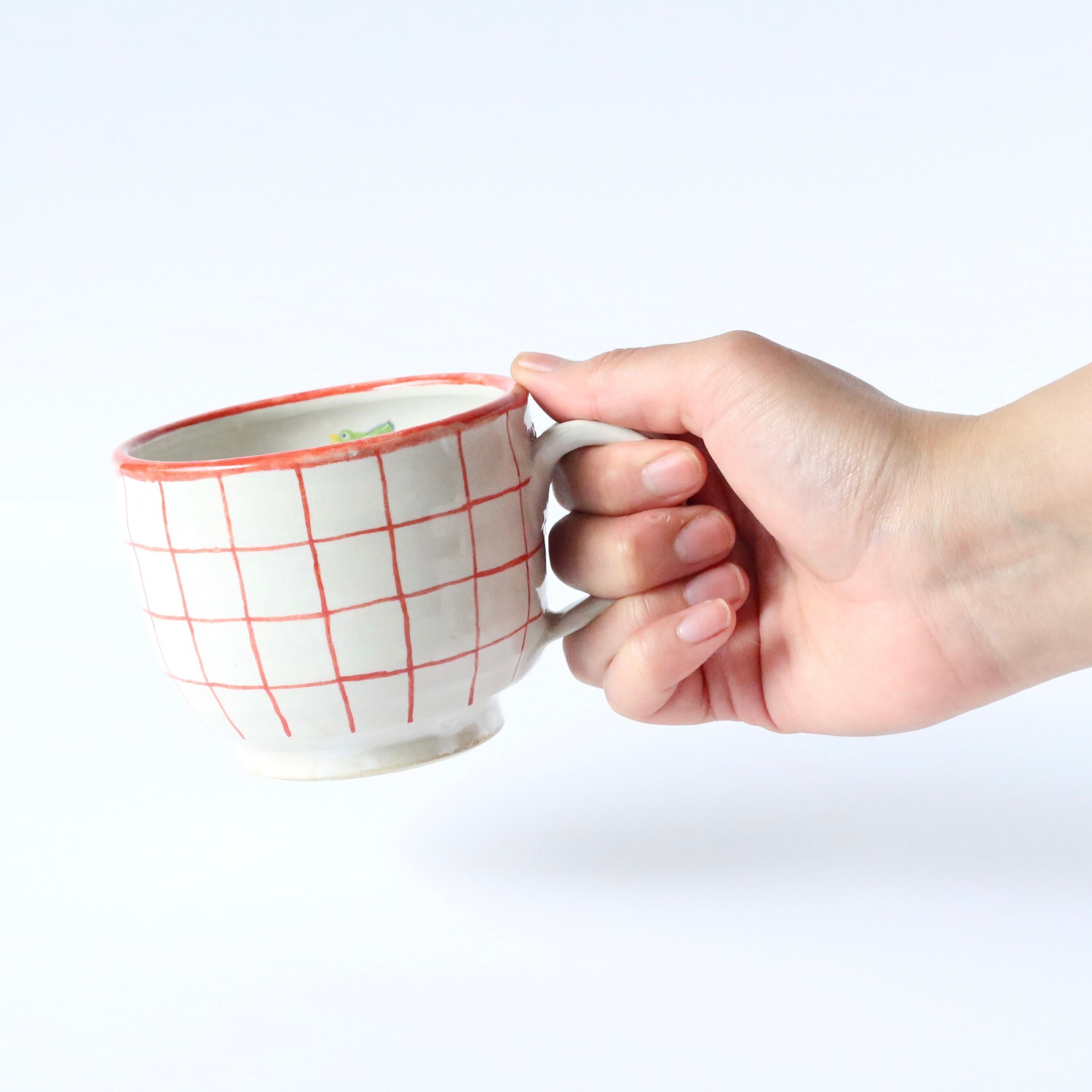 鮮やかな赤色で格子模様を描いたマグカップです。