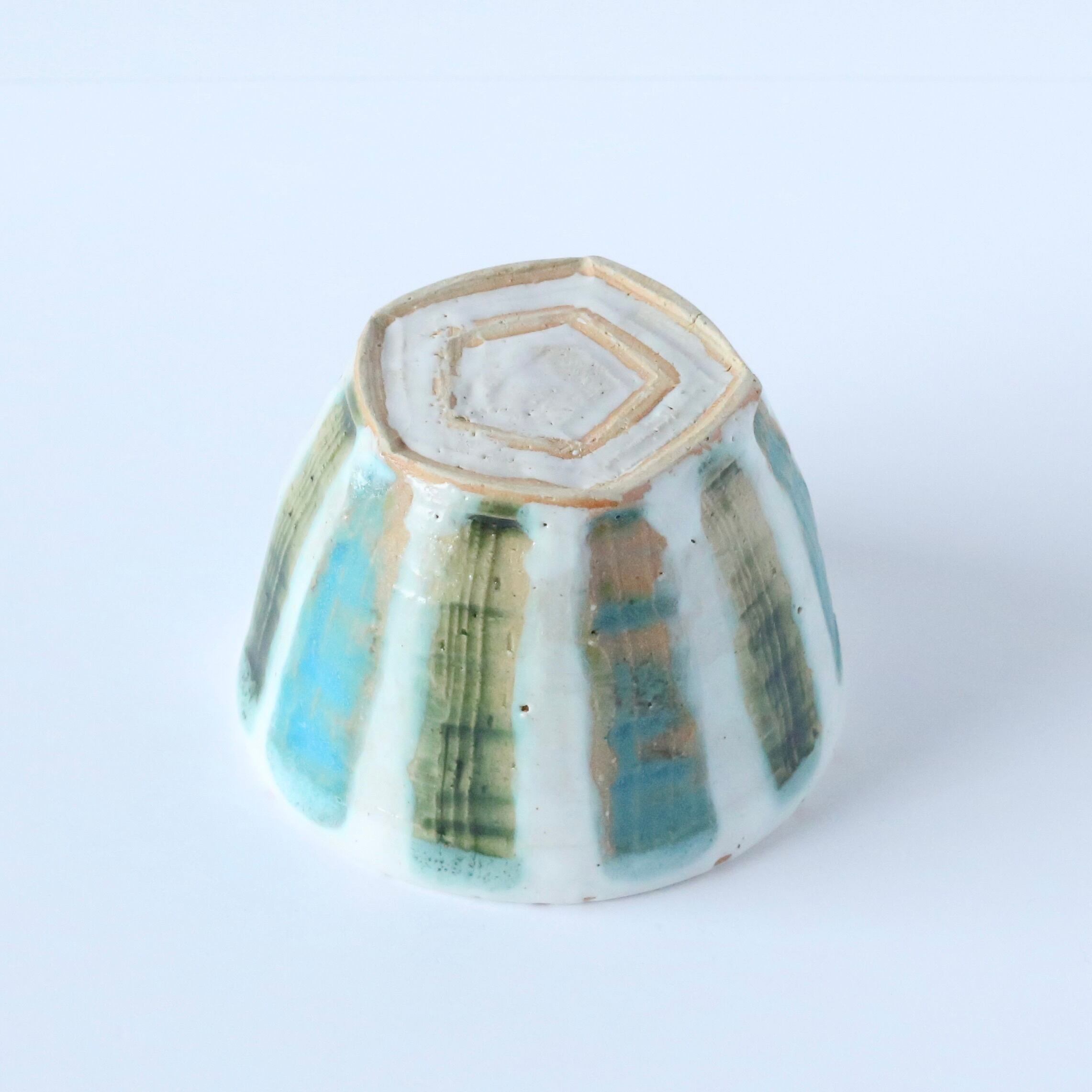 優しいホワイトの釉薬が全体を包み込んでいて、ブルーとグリーンの釉薬が交互にデザインされています。