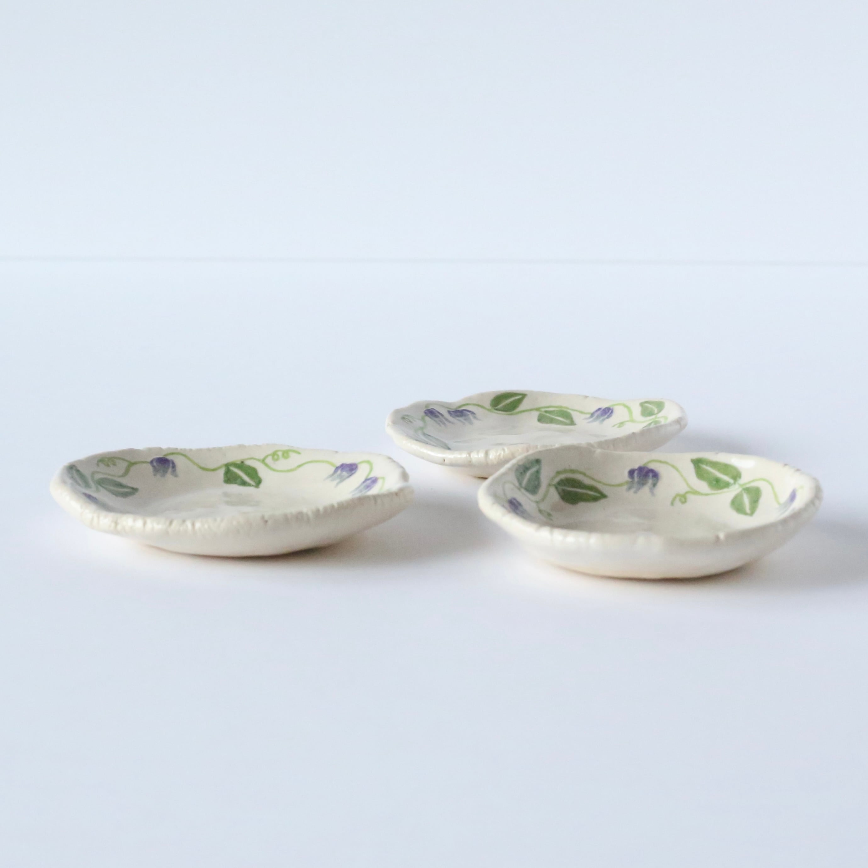 ひとつずつ手びねりで作ったミニ皿に、クレマチスの花を絵付けしました。