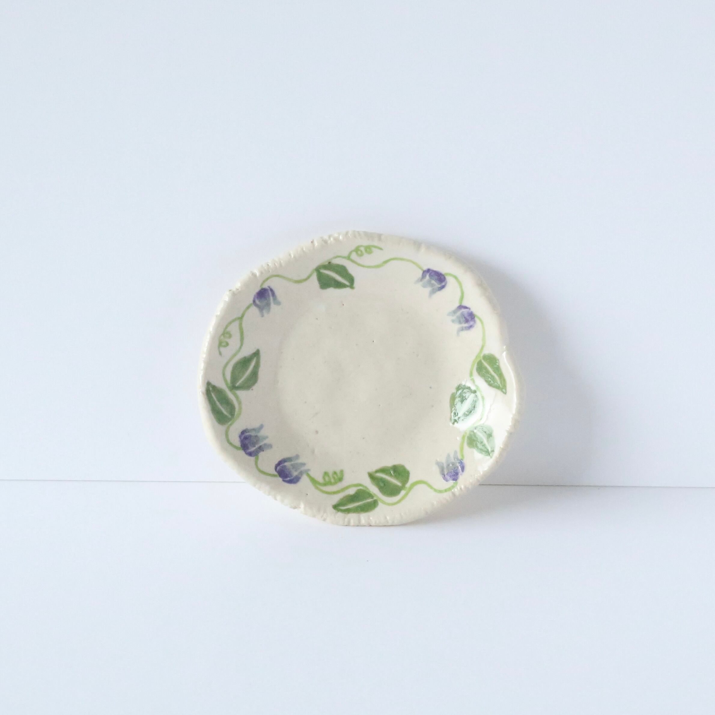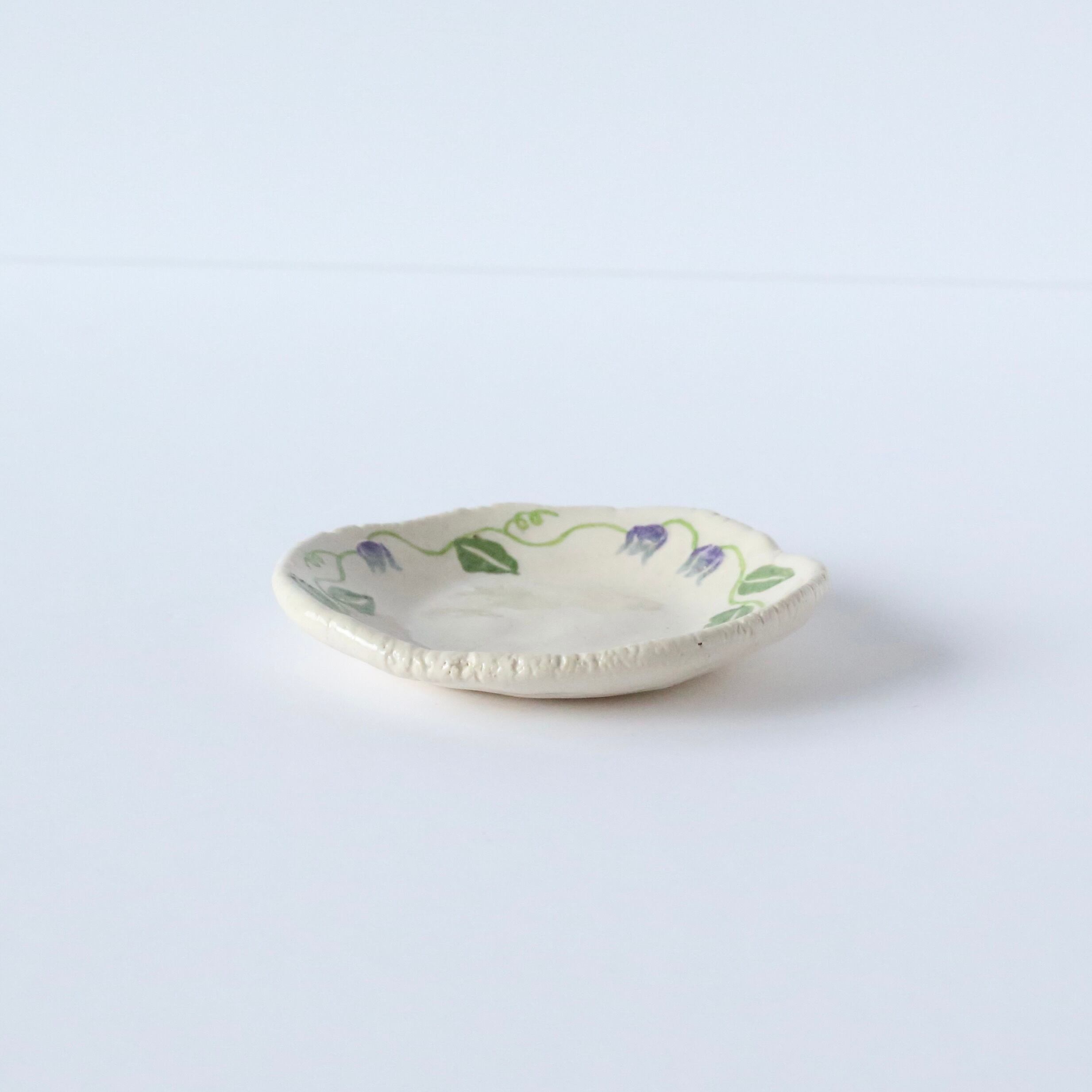 This mini plate is hand-built one by one and delicately painted with a clematis flower.