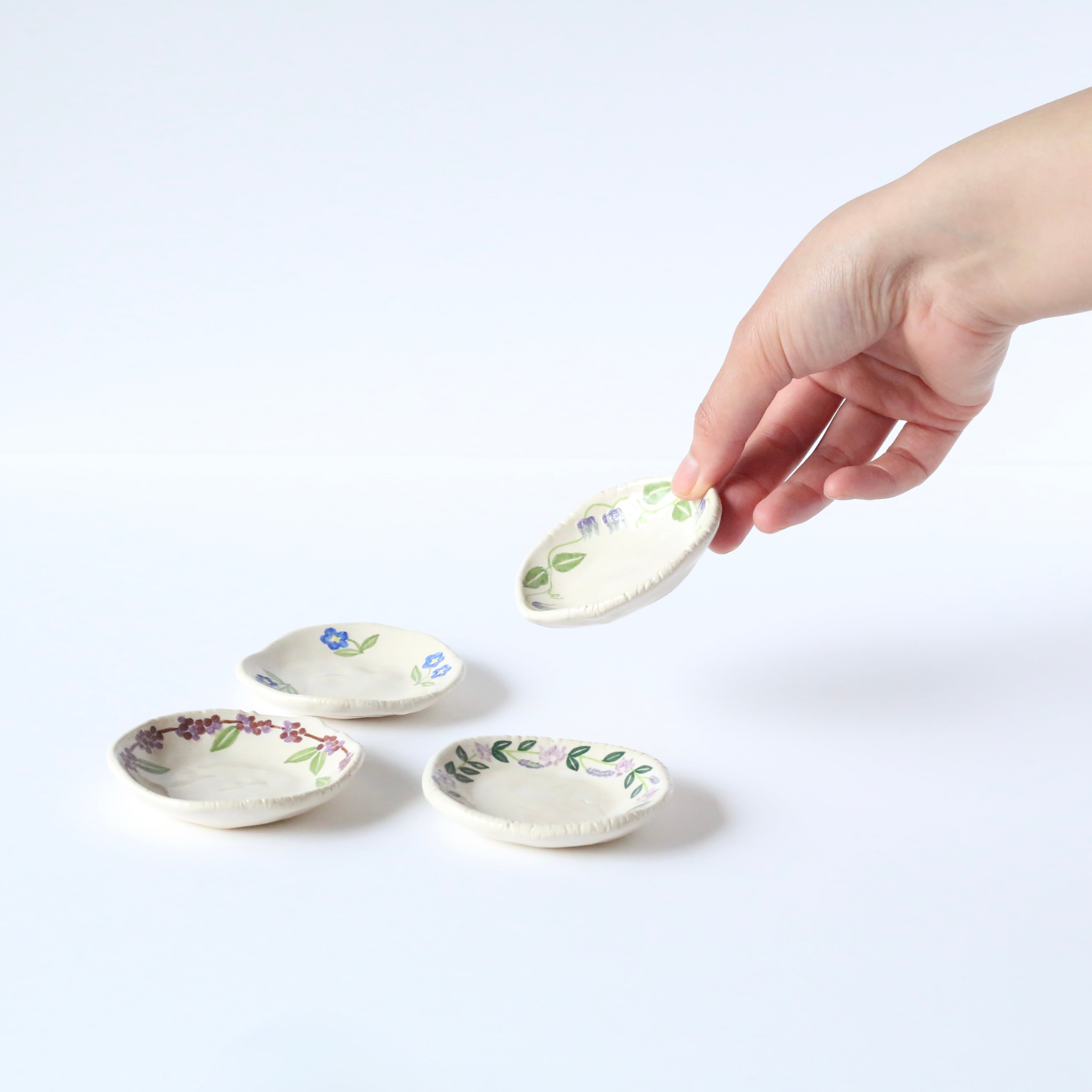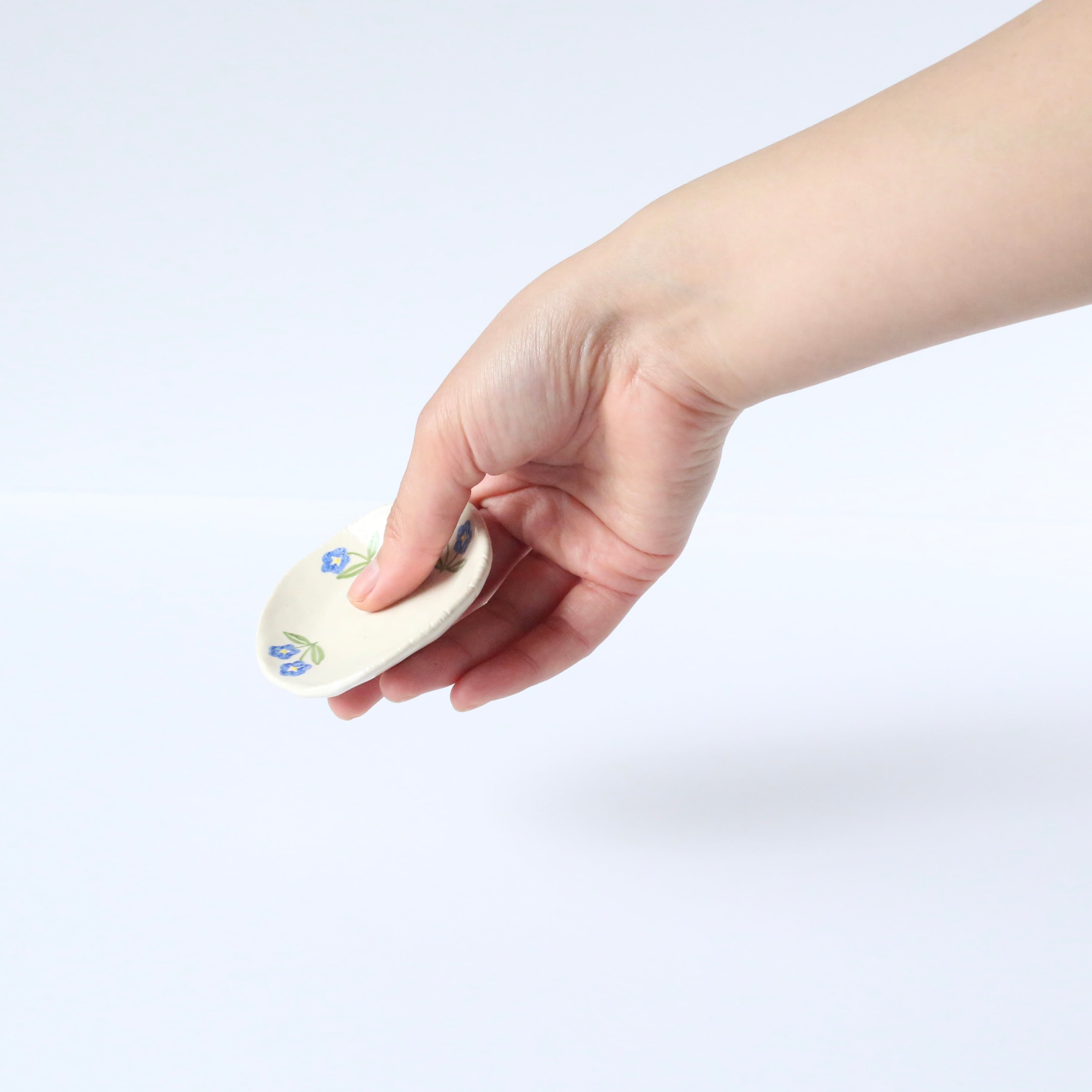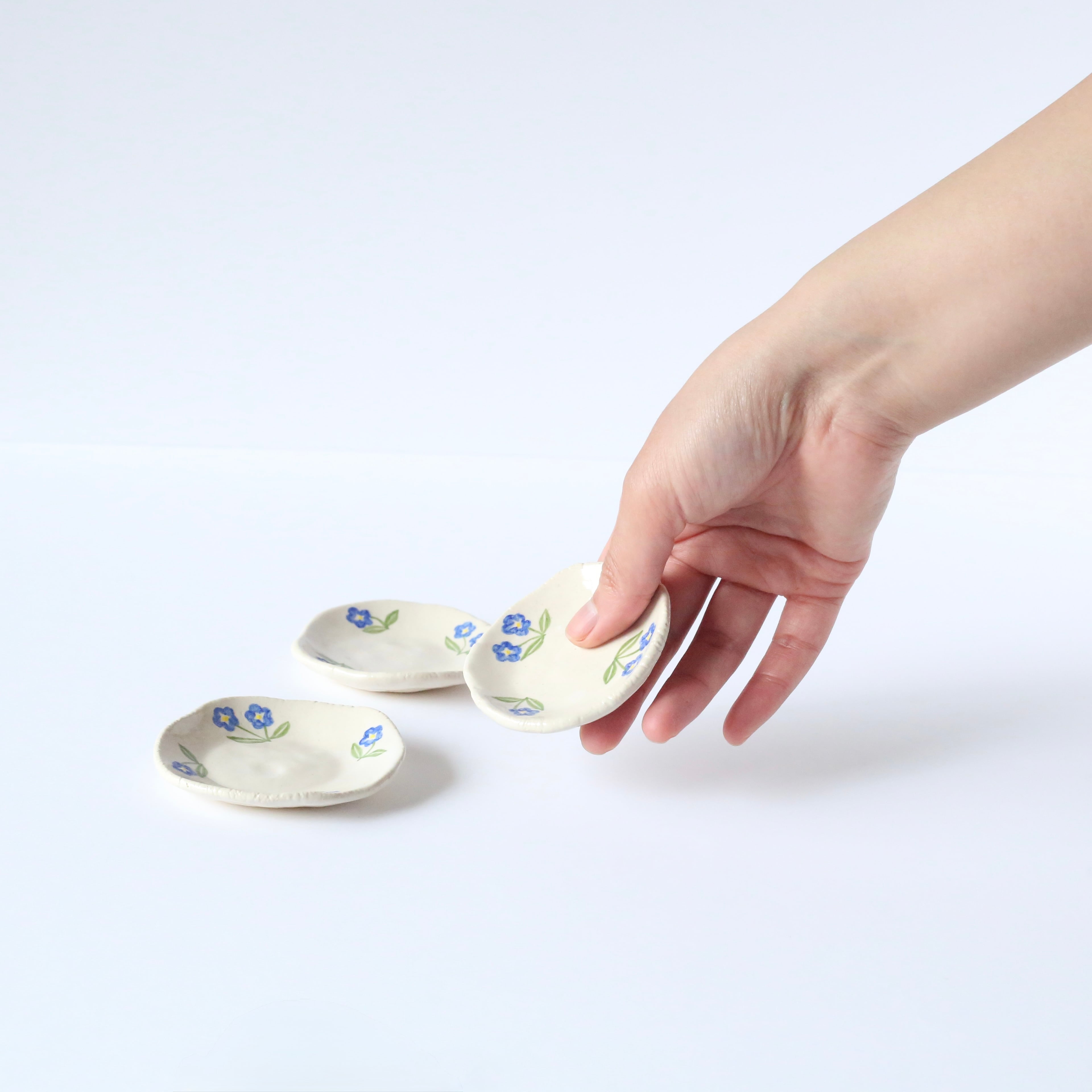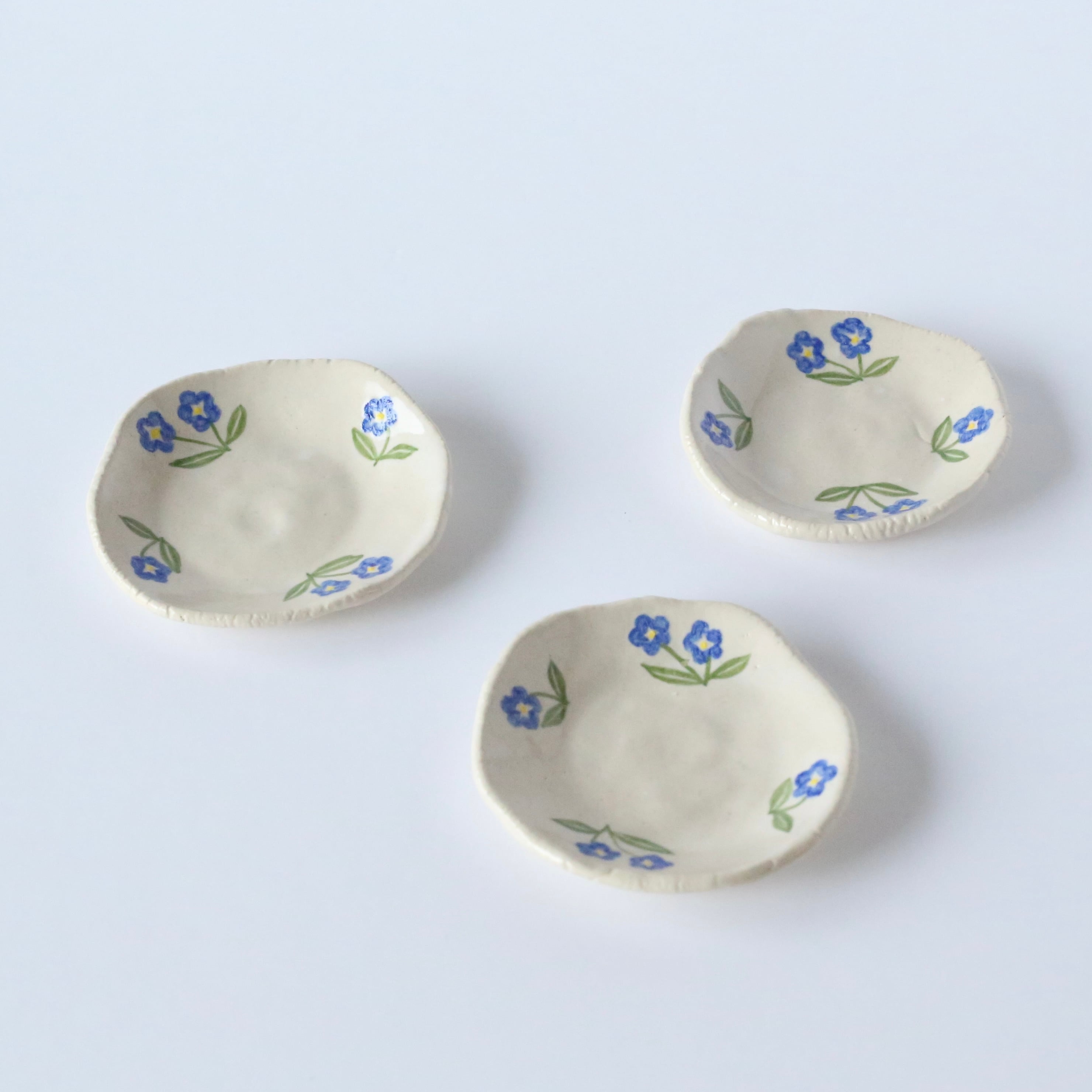 ひとつずつ手びねりで作ったミニ皿に、勿忘草の花を絵付けしました。