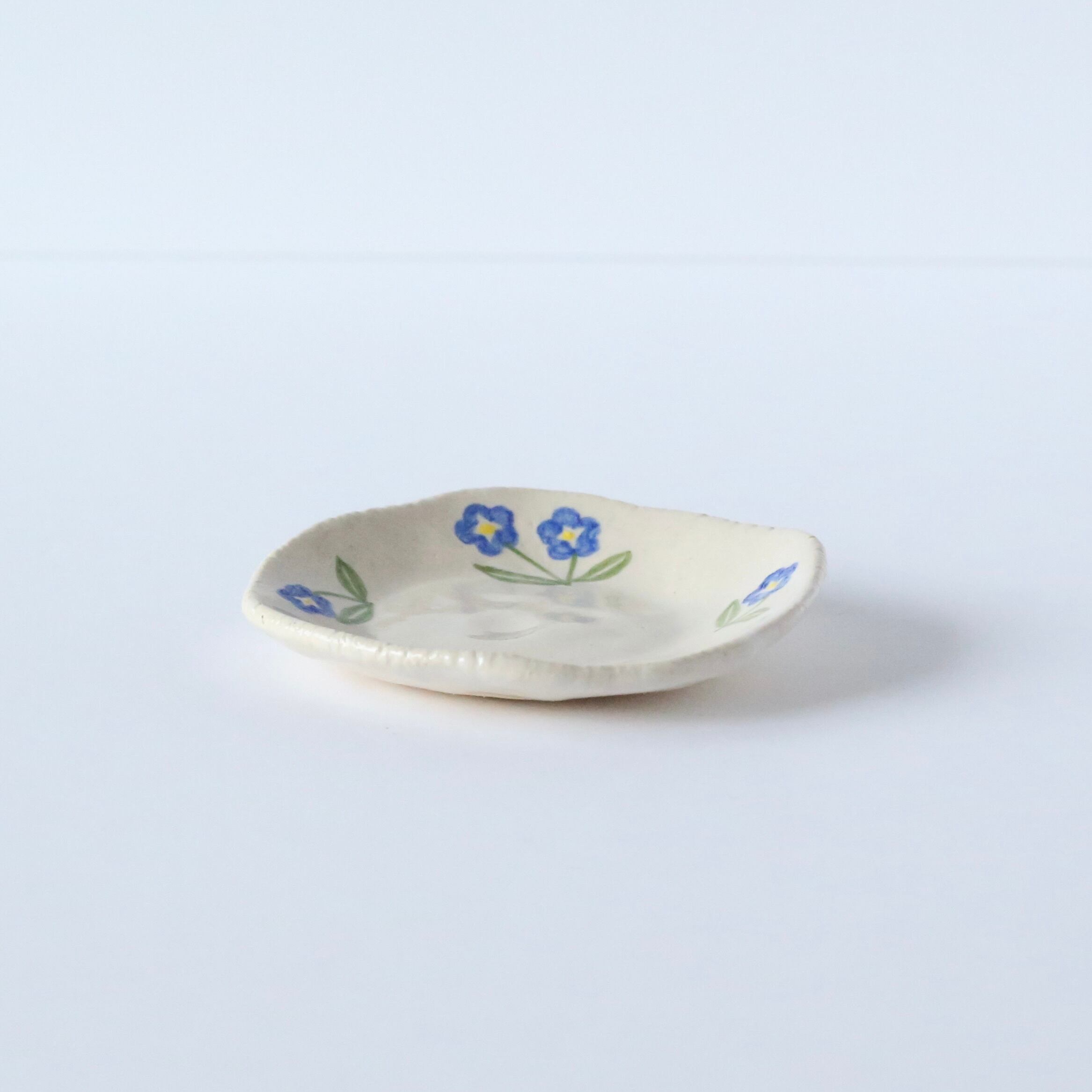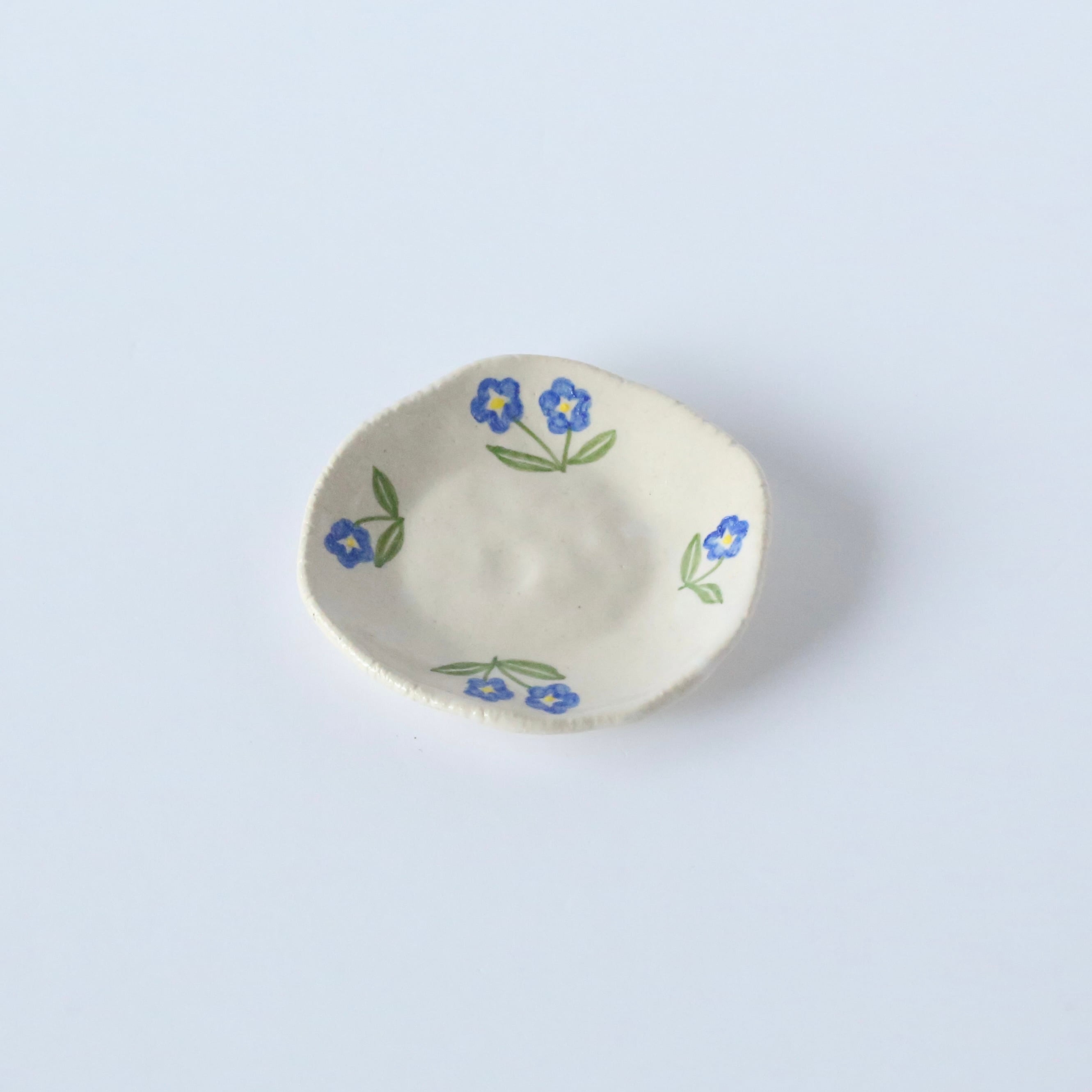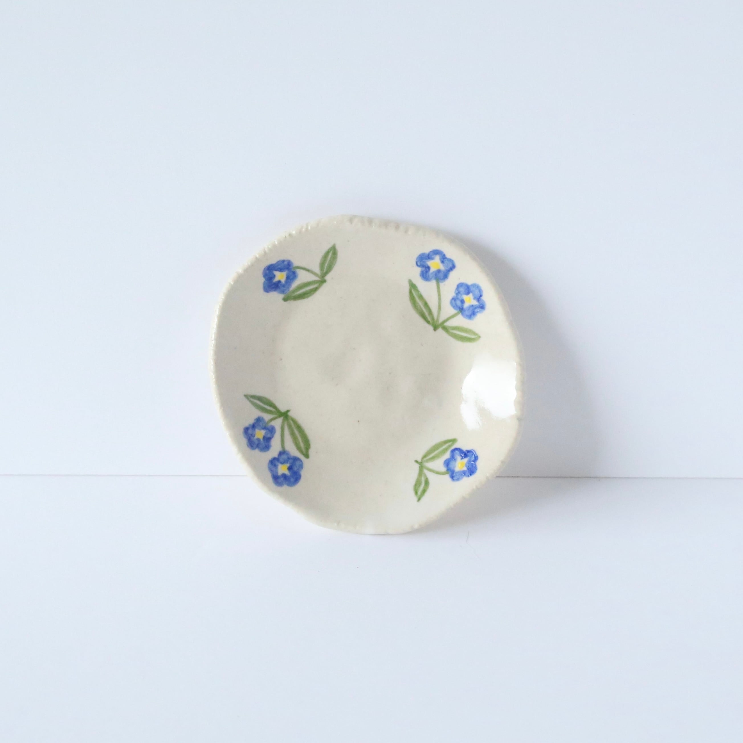 This mini plate is hand-built one by one and delicately painted with a forget-me-not flower.