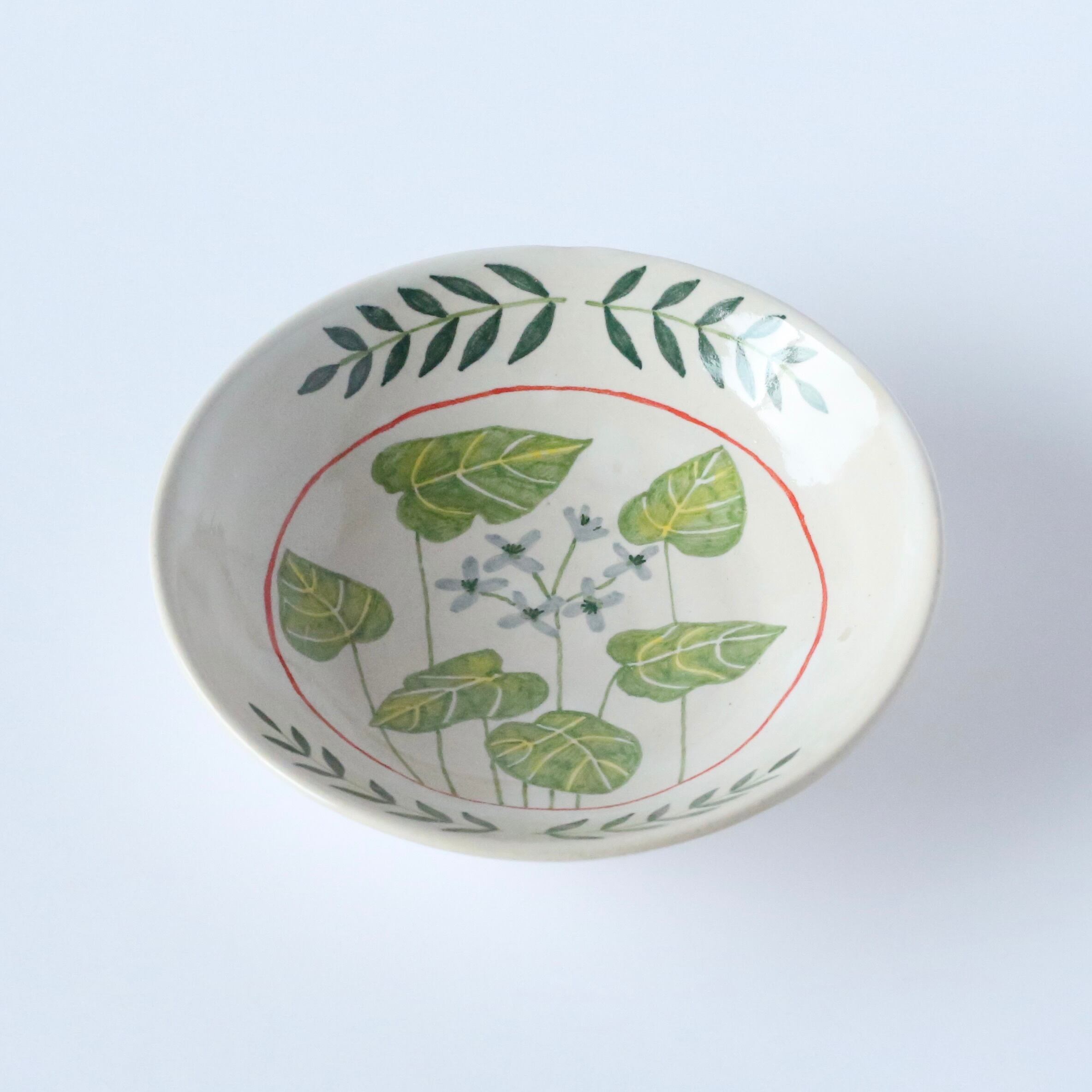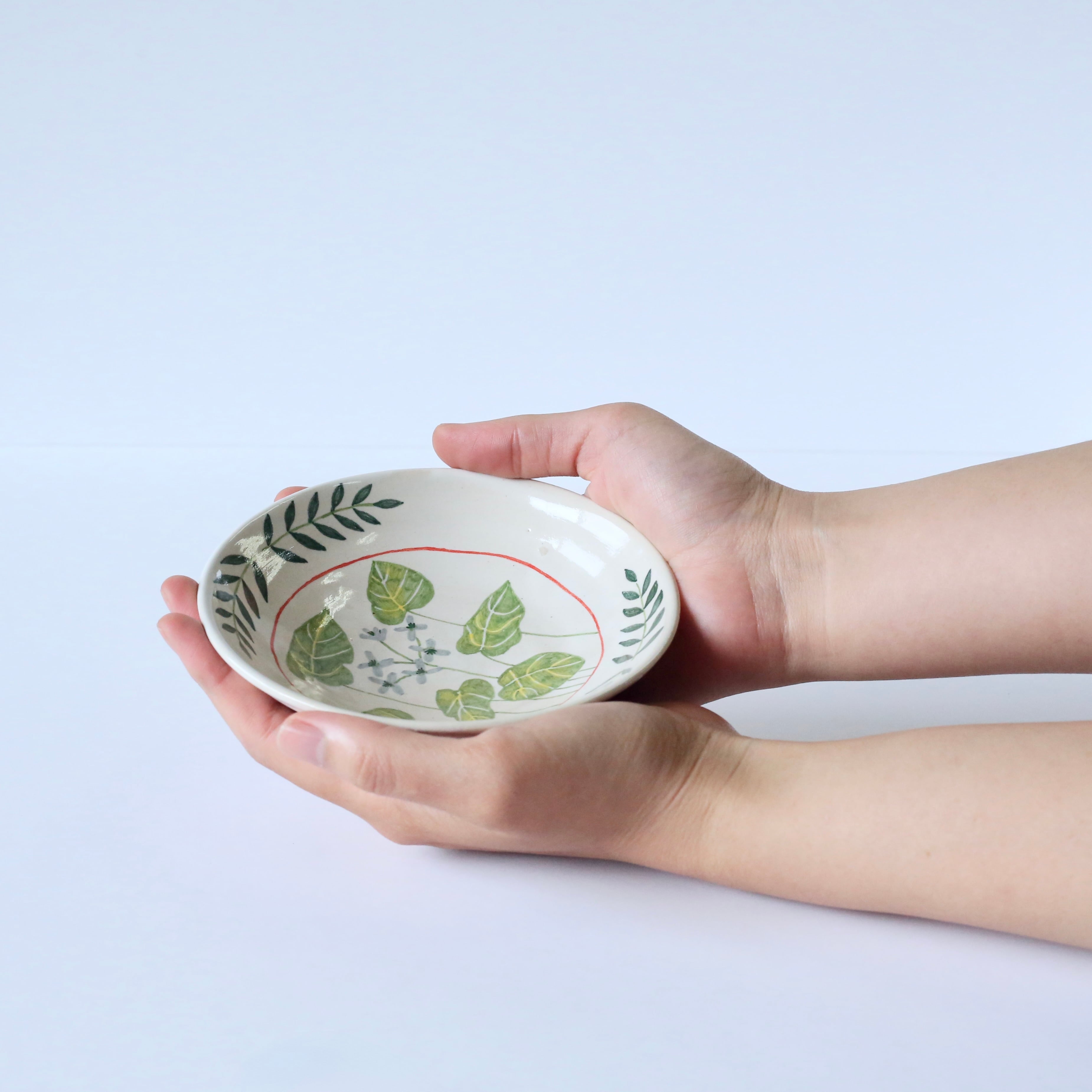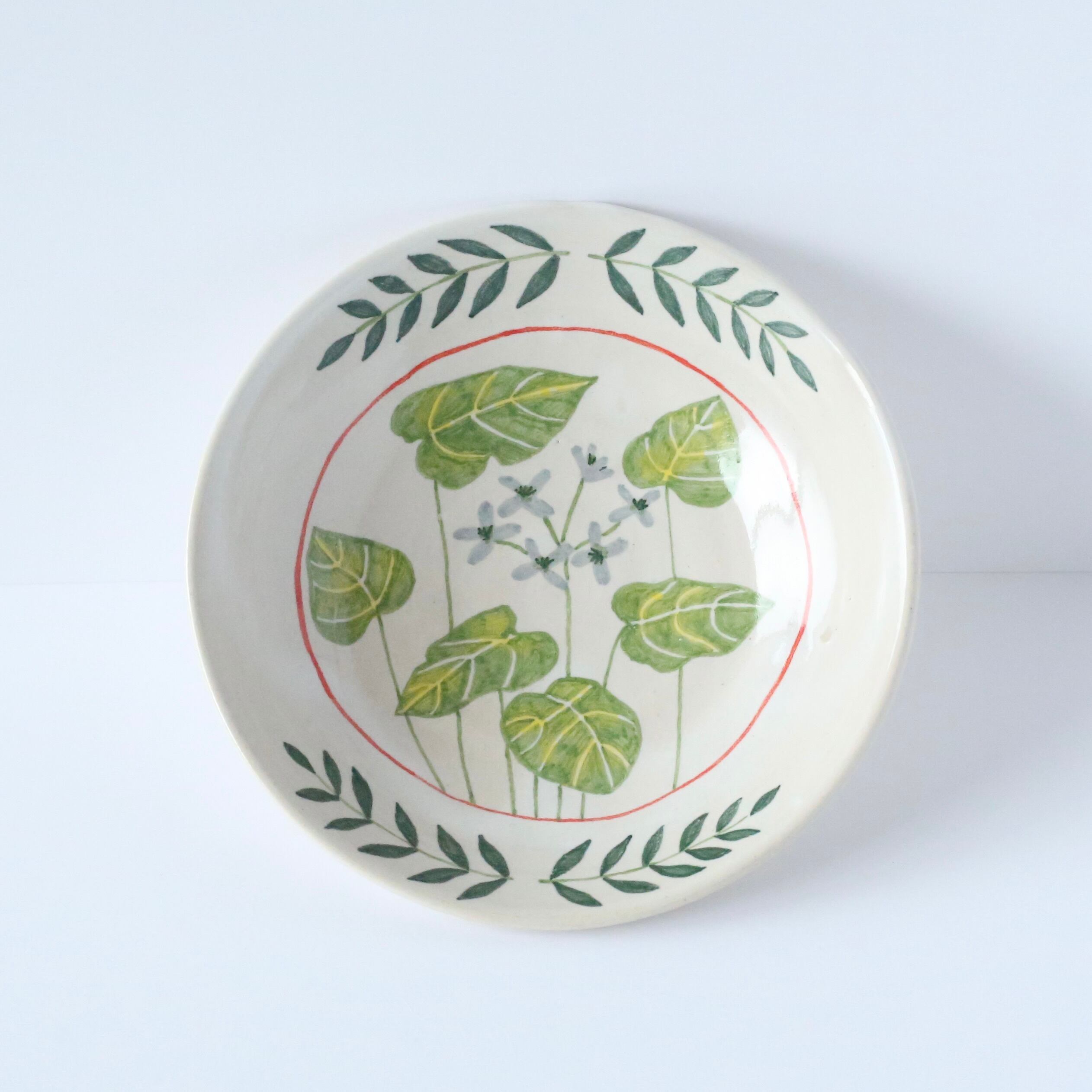 This small plate is hand-painted with motifs of wasabi leaves and flowers.